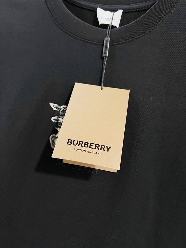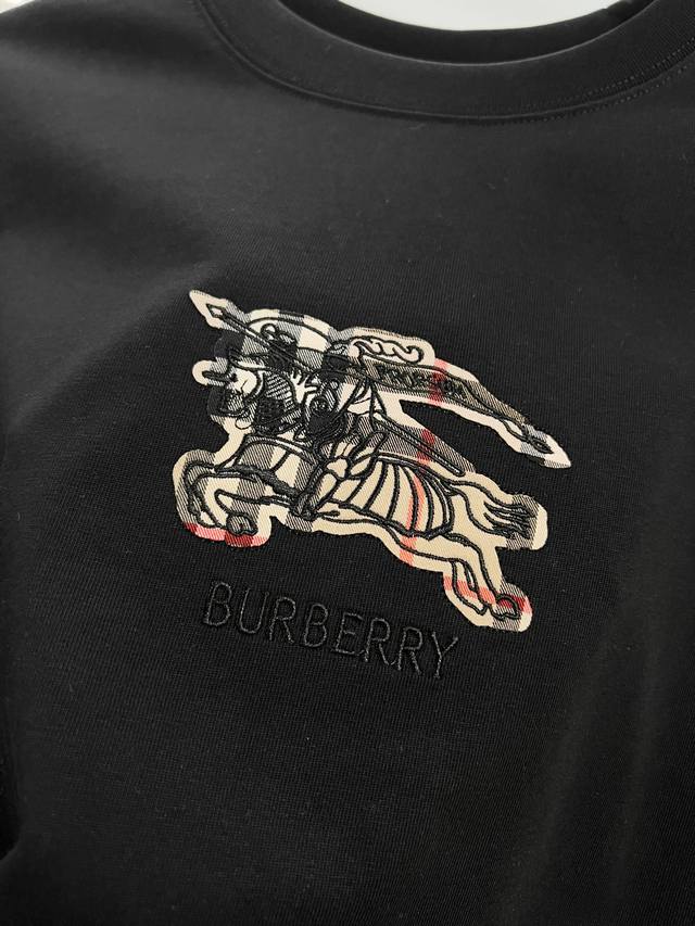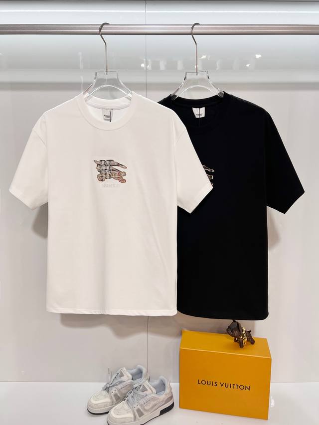 Burberry High-Quality 320g Crew Neck Short Sleeve T-Shirt, featuring the brand's classic embroidered check pattern, horse logo, and lettering. Officially synchronized with the 2025 SS collection, this high-quality, fashionable, versatile, and trendy T-shirt is made with original fabric and tags. Colors: Black, White. Sizes: S, M, L, XL.