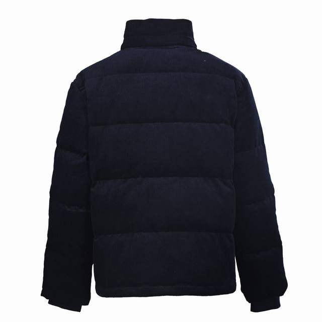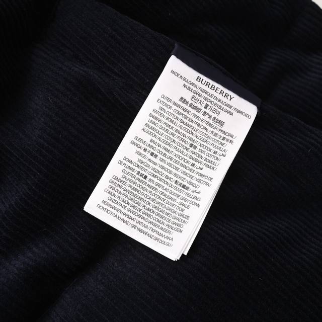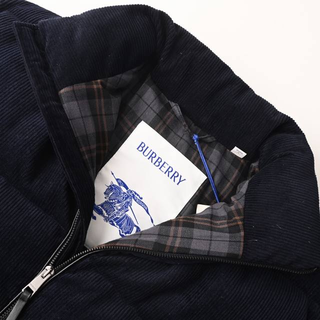 Burberry War Horse Corduroy Stand Collar Down Jacket. Made of cotton corduroy fabric with soft, three-dimensional corduroy stripes, it's warm, durable, and has a retro, eye-catching look. Custom weaving and dyeing avoids color differences, and high density ensures excellent drape. It's filled with 300g of 90% white duck down for maximum warmth; the classic check cotton-blend lining adds to its distinctive look; and the cashmere ribbed cuffs and hem provide a comfortable fit. It features a laser-engraved sheepskin logo, bound seams to prevent down leakage, and aligned corduroy stripes for a more refined look. It also comes with a custom leather logo and zipper pull, ensuring a consistently high-quality feel. Size: S-XL