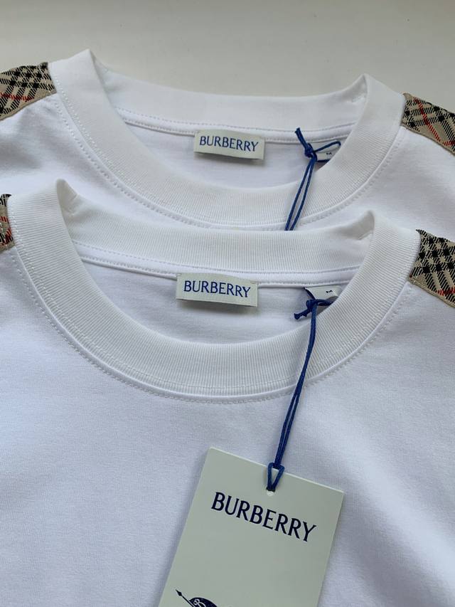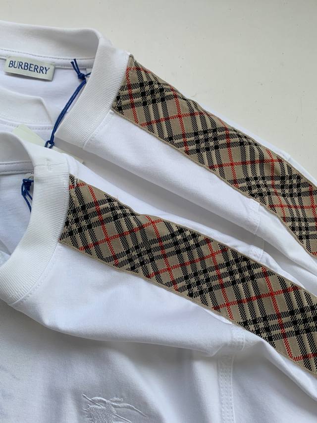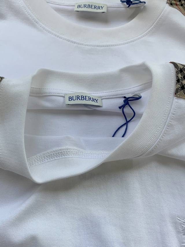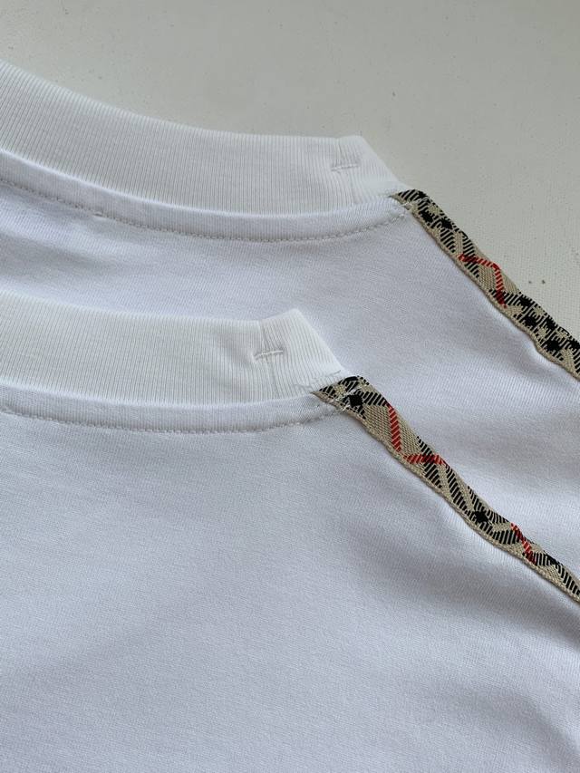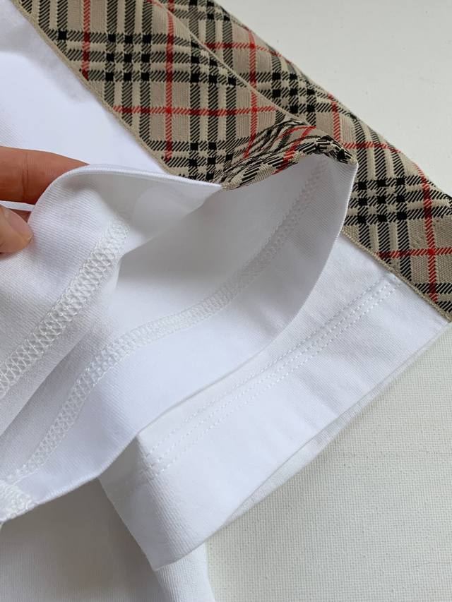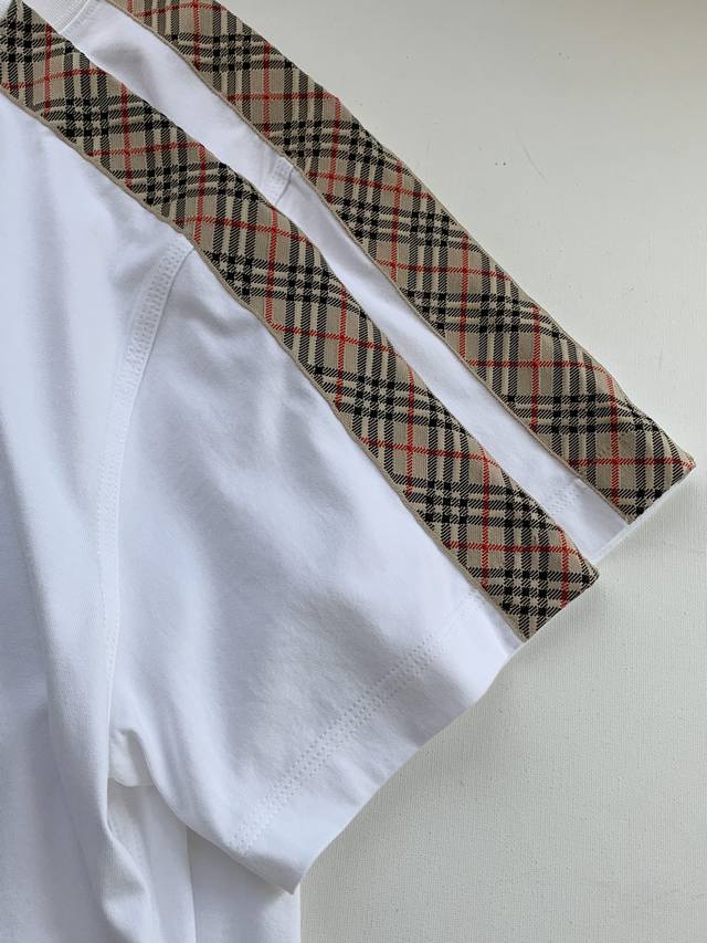 The century-old classic plaid sleeves are clean and not fancy. The chest is embroidered with Burberry Warhorse 10,000-needle precision imported machine. Zoom in to see the details, which is different from the market currency. The shoulder woven plaid laser-burned stitching is positioned and sewn. The plaid stitching is all sewn with 0.1 needle and thread. The cuffs, hem, and both sides of the body are 3-needle double-needle craftsmanship. The workmanship alone is much higher than ordinary short sleeves. Details determine quality. 260g cotton washed fabric