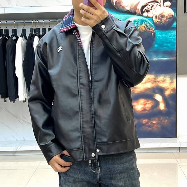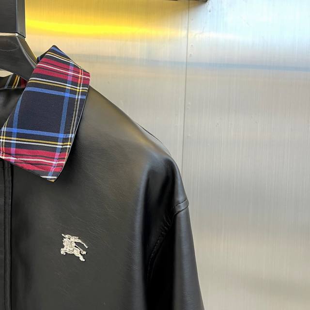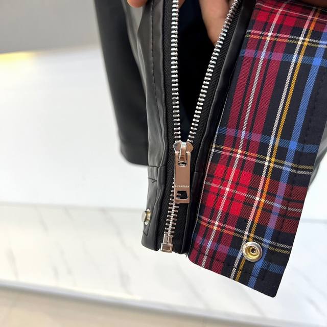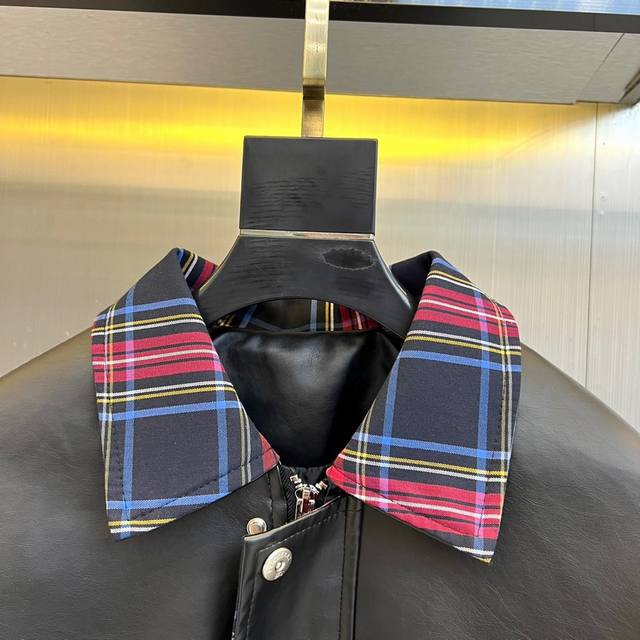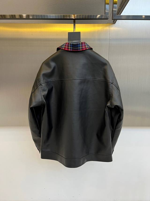 Burberry's Fall/Winter 2025 men's leather jacket redefines motorcycle style by blending classic rock spirit with contemporary luxury aesthetics. This jacket is crafted from high-gloss black coated PU leather, with both the base fabric and lining made of 100% polyester, offering a texture comparable to genuine leather while boasting superior durability and easy care. The iconic red tartan lapel is the visual focal point, creating a striking visual contrast with the black leather. A metal zipper runs the length of the jacket, with a high-quality zipper pull ensuring a smooth opening and closing experience. A delicate embroidered Gg logo adorns the left chest, highlighting the brand identity. The two slanted pockets feature a three-dimensional flap design, cleverly combining practicality with stylish layering. The slim fit ensures a clean silhouette, while ribbed cuffs and hem enhance the fit. This jacket perfectly balances retro biker style with modern fashion, pairing well with jeans for a street-style look or dress pants for a trendy mix-and-match style. It's poised to become a signature piece in the Fall/Winter 2025 men's wardrobe, combining luxurious quality with practicality. (Model 173cm, 143kg, size 50