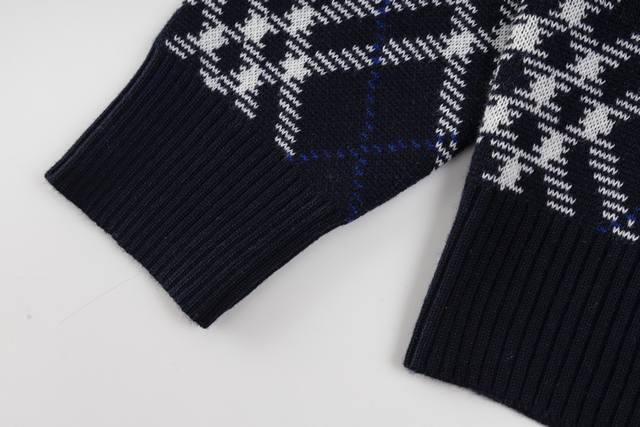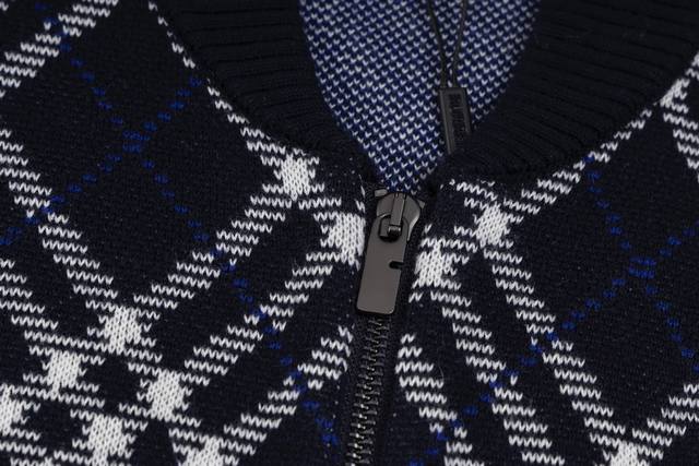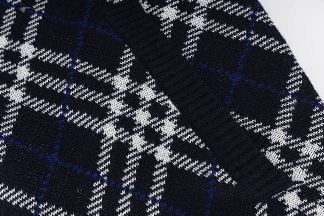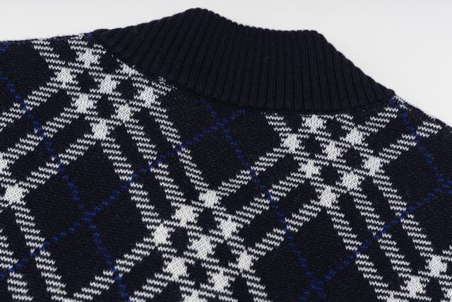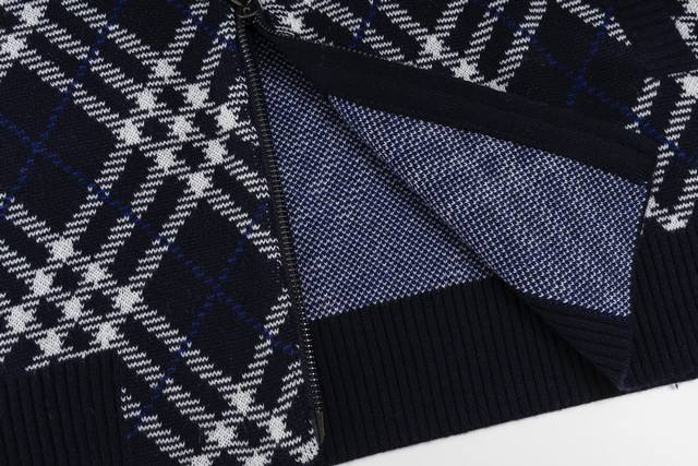 Exclusive Supply Ddd Burberry Diamond Check Zip-Up Sweater Jacket. Developed from the original 55,000 purchased, this jacket is crafted from a lightweight wool blend, offering both warmth and comfort. The fabric incorporates the iconic Burberry check jacquard knit, presented in a new season's dark hue, showcasing the brand's understated luxury aesthetic. The jacket features a regular fit with a two-way zipper closure, the zipper pull adorned with the prominent B-shaped logo. Side pockets with patch trim are both practical and maintain a clean, sleek silhouette. Ribbed knit trim at the cuffs and hem enhances wind protection and comfort. This jacket perfectly blends traditional craftsmanship with modern design, showcasing Burberry's consistent British style and superior quality through exquisite jacquard knitting and meticulous attention to detail. Ddd Size: SML DDD