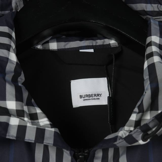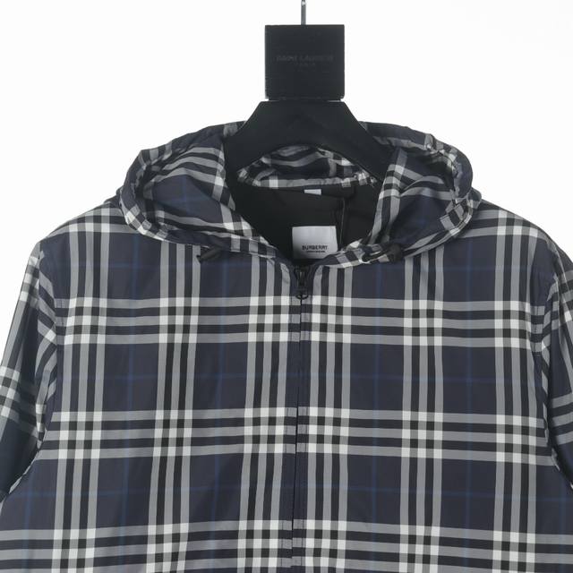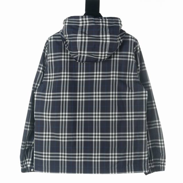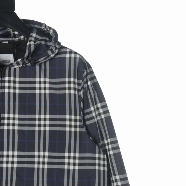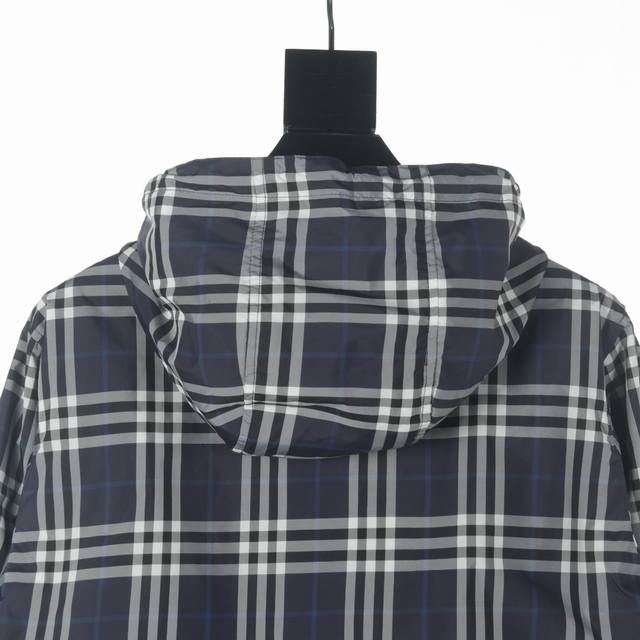 High-quality Burberry 2023 new blue and white check hooded jacket. Original price 16900. The fabric is custom-woven and dyed using five different yarns in blue, white, black, green, and purple. Each yarn is analyzed and custom-made from the original material. The collar and cuffs use 50D knit interlining for a crisp feel. The cufflinks are made of brass; cheaper options are 1.5, but we use 4.5 for a more substantial feel. The body seams, sleeve seams, shoulder seams, collar, and cuffs are all aligned. The fabric should not have excessive weft skew. The stitching needs adjustment to ensure perfect alignment. Size: S-XL