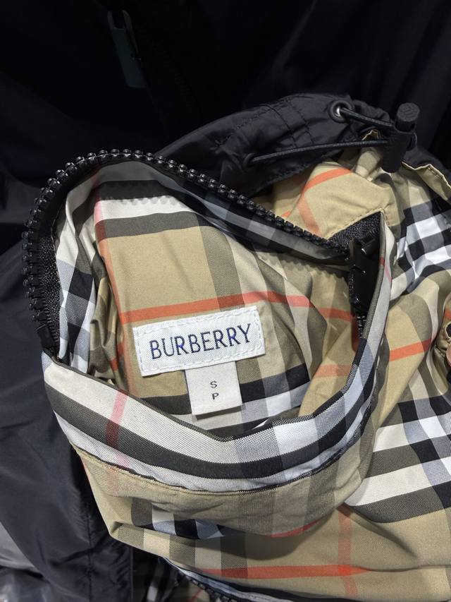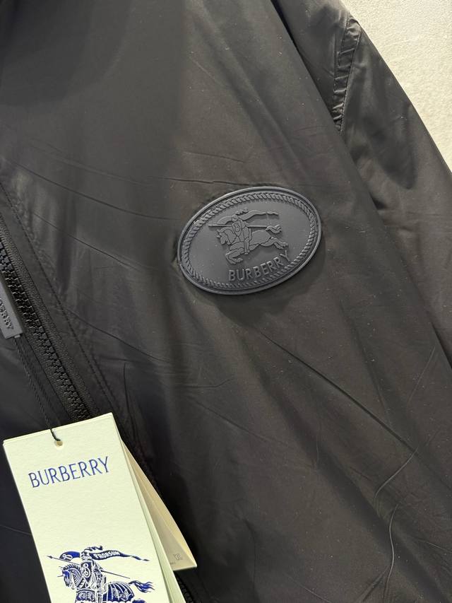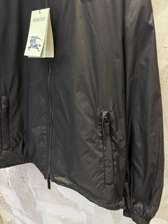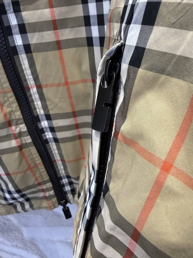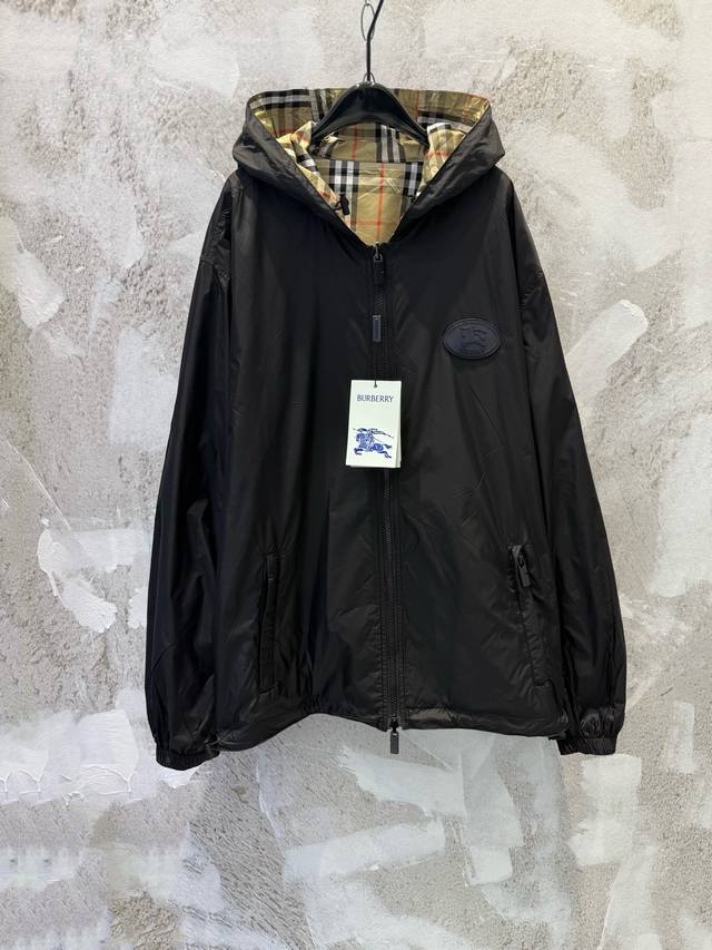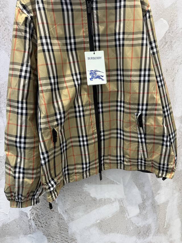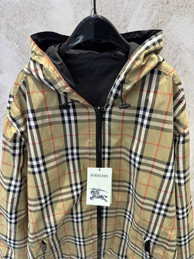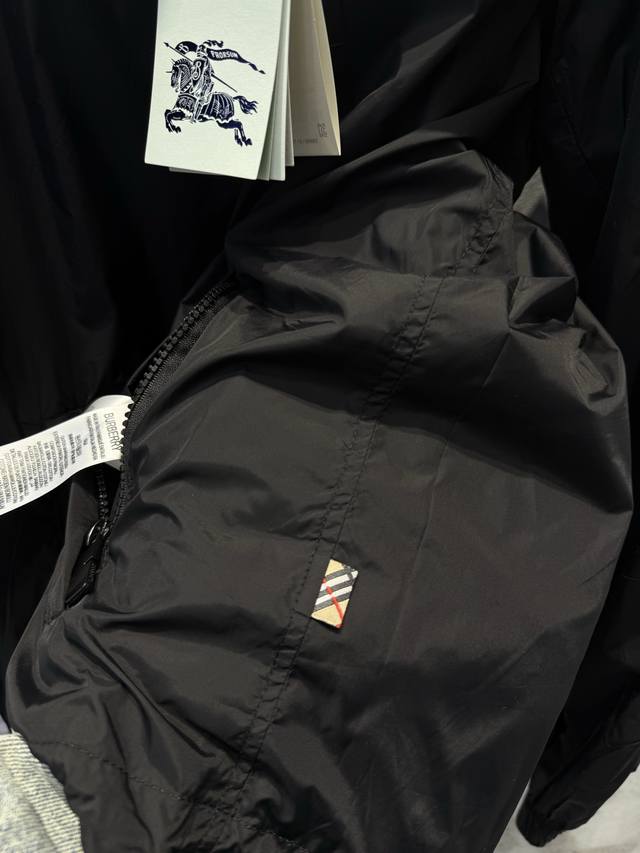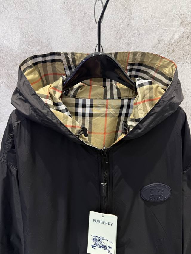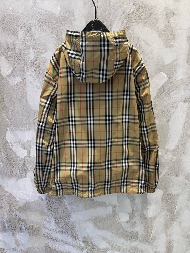 Lightweight reversible jacket with a fine-woven Burberry check pattern. Features a B-shaped zip pull for a relaxed fit. The hooded version is reversible, with the reverse side made of solid nylon and adorned with a knight's emblem appliqu