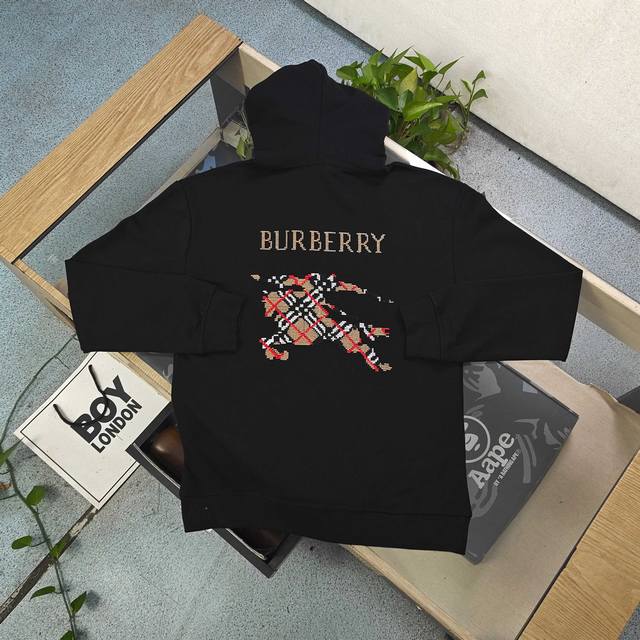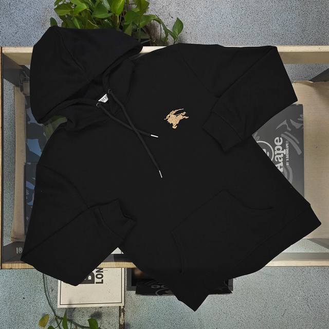 2025 Autumn/Winter New Burberry Classic Embroidered Horse Logo Casual Couple Hooded Terry Cloth Sweatshirt. Made of 340g heavy terry cloth, it has a solid and crisp texture, and is comfortable and stylish to wear. The classic solid color base is paired with a striking letter print, which is simple yet recognizable. The brand's iconic badge on the side of the sleeve adds a touch of style.