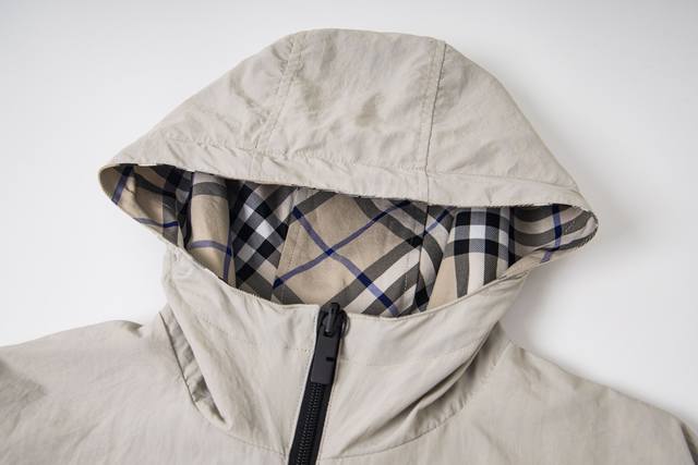 Official 1:1 Original Quality Burberry New Check Equestrian Reversible Jacket. This lightweight hooded jacket is made of woven nylon fabric and features an adjustable drawstring hood and double zippers. The hem is adorned with equestrian appliqu