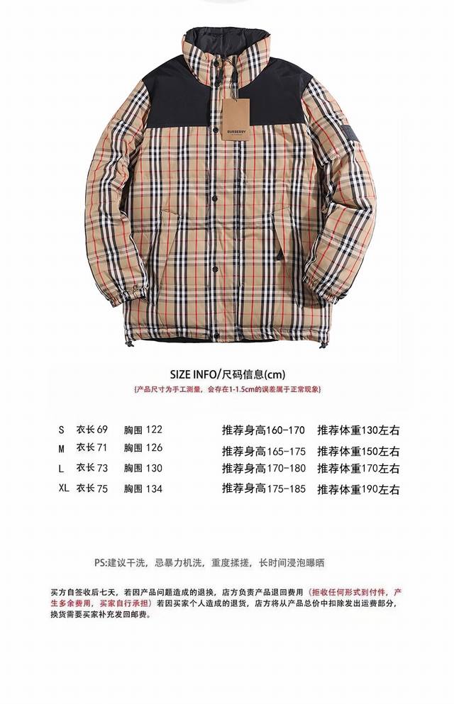 Special Price 270 RMB, Original Price 530 RMB Remaining Stock: Xs 8 S 10 M 10 L 12 Special Price, No Returns or Exchanges, Please Do Not Purchase if You Mind. Comes with Dust Bag Packaging. Classic Reversible Plaid Down Jacket. This is a detailed look at the plaid pattern of this classic reversible down jacket. It's a super practical and versatile style. The jacket is custom-woven and dyed, with 100% polyester for both the inner and outer layers. The shoulder seams are made of 100% nylon. All hardware and accessories are custom-made. Both sleeves have logos on the sides, and there are imported silicone tags. The hem has an adjustable drawstring, and the pockets have custom-made zippers. The down content is 90% white goose down and 10% white goose feathers, meeting national standards. The black side of this Bbr reversible plaid down jacket is also detailed. It's a classic reversible down jacket, custom-woven and dyed, with 100% polyester for both the inner and outer layers. The shoulder seams are made of 100% nylon. The sleeves have logos on the sides, and there are imported silicone tags. The hem has an adjustable drawstring, and the pockets have custom-made zippers. The back collar has a detachable size label. Sizes: S, M, L, XL, DDD