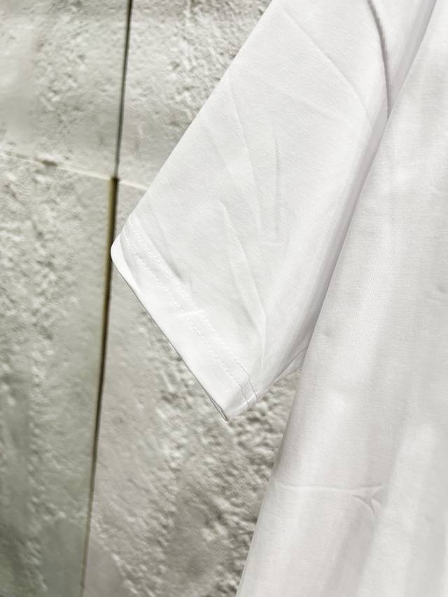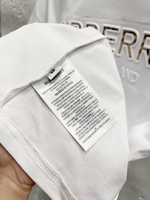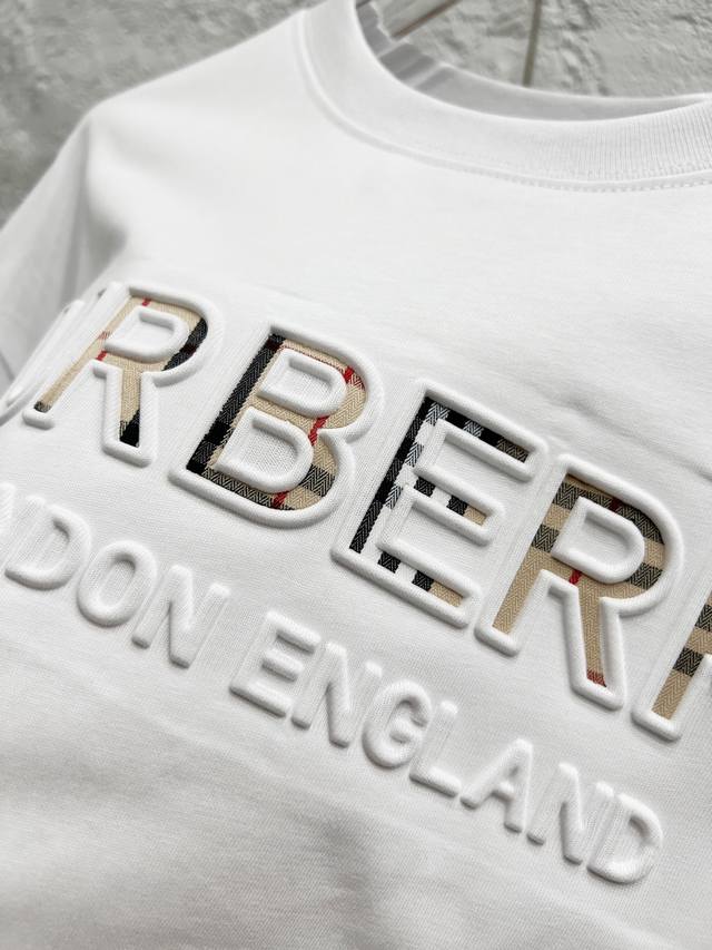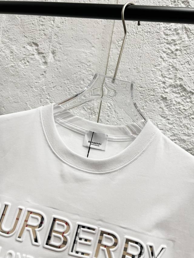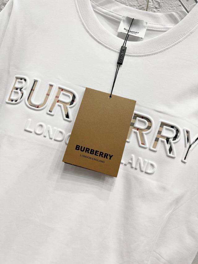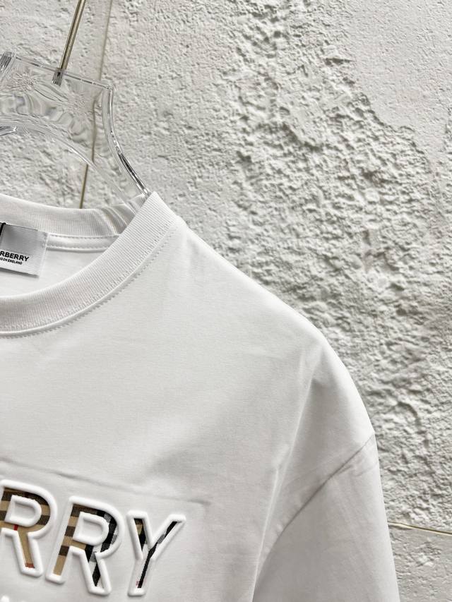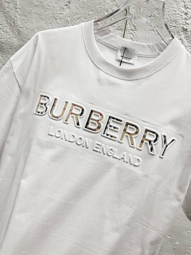 Style No.: T52 Burberry & Burberry Fw25 Round Neck Short-Sleeve T-Shirt with Embroidered Letters on the Chest, Unisex. Friends, I can't wait to share this Burberry 2025 Spring/Summer new short-sleeve round neck T-shirt. Its design is super avant-garde, and the brand logo has been heavily processed, making it very eye-catching. Made of high-end custom-made mercerized cloud cotton fabric, it's soft and skin-friendly, and incredibly comfortable to wear. The exquisite stitching is of boutique quality, with superb attention to detail. The classic black and white colors are versatile and stylish, making it a true fashion treasure! 290G Double Yarn Ribbed Washing Label Accessories. Size: Xs-SML. Color: White.