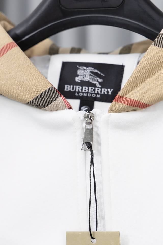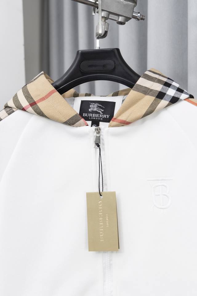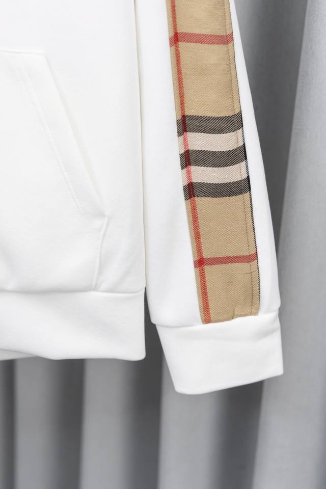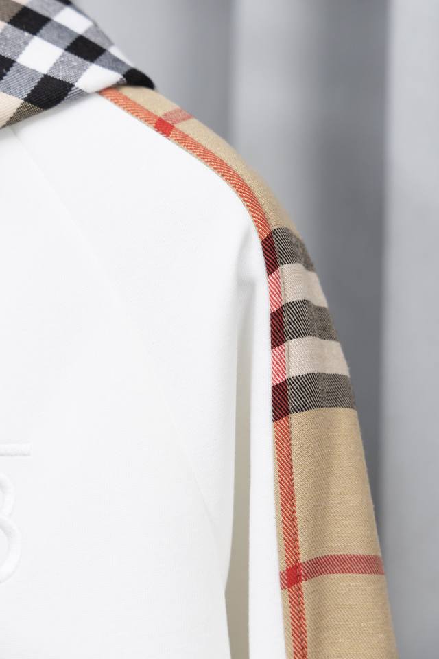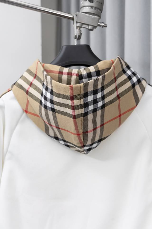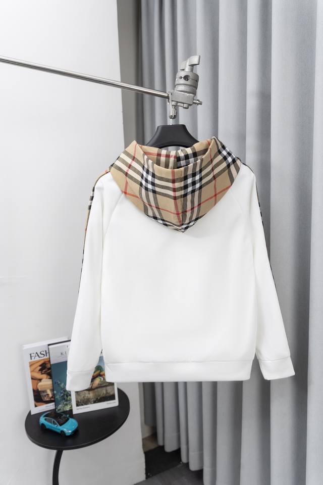 Style Number: S012 Burberry Embroidered Logo Patchwork Plaid Zip-Up Hooded Sweatshirt Jacket. This jacket features a simple patchwork design that will never go out of style. Stylish, sophisticated, and versatile, it's a must-have casual jacket that can be both sweet and edgy. Unisex. The classic plaid design on the sleeves is incredibly appealing and requires minimal styling effort. Colors: Black, White, Blue. Sizes: S-XL.
