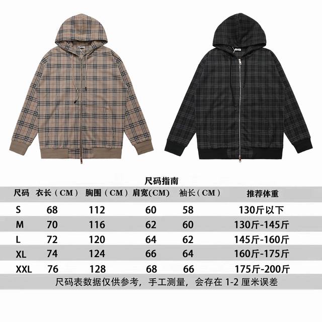 Top Version] Product Name: Burberry Classic Check Zip-Up Cardigan Hooded Sweatshirt Jacket Sizes: S-XL Colors: Black, Khaki Fabric: Custom-made original double-yarn 500g high-density pure cotton Same as brick stores. First-hand genuine product development and research. Welcome to compare! The fabric uses ZP custom-woven and dyed pure cotton double-yarn tightly woven cotton, 500g, clean surface, clear texture, soft and comfortable, good color fastness, not easy to fade. The ribbing is custom-woven and dyed with no color difference. Complete set of new boutique accessories. Unisex style. Compare freely with other versions on the market.