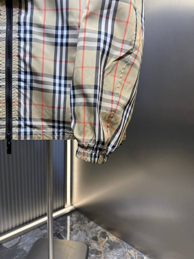 Top-quality replica from Guangzhou, the highest quality in the entire Guangzhou Thirteen Factories market, distinguishing it from low-quality goods. Different prices for the same picture indicate different versions. Top-tier original Burberry 25Fw early autumn new arrival. Reversible plaid hooded jacket. Lightweight jacket, one side decorated with Burberry plaid, the other made of solid-color nylon fabric, adorned with brand logo appliqu