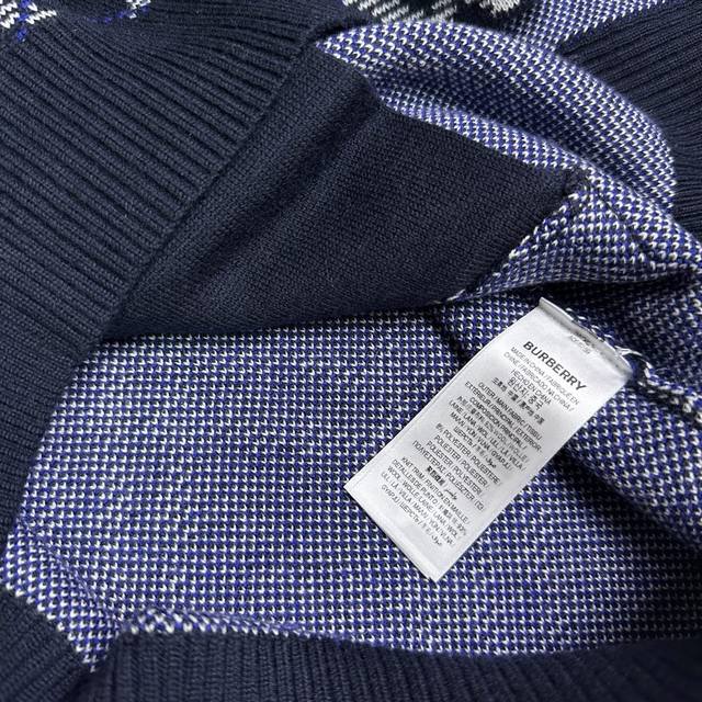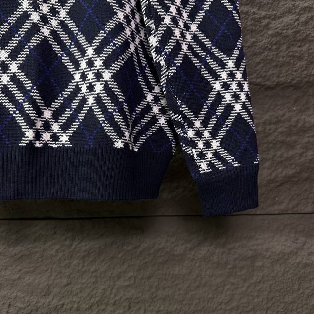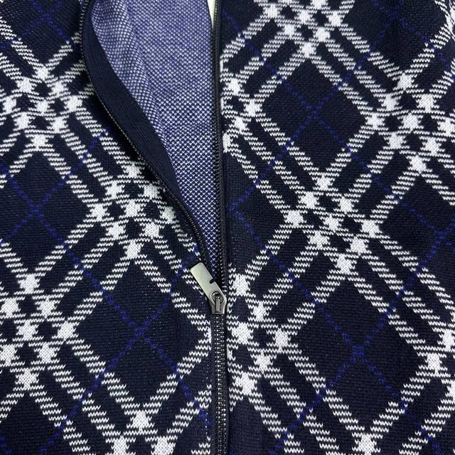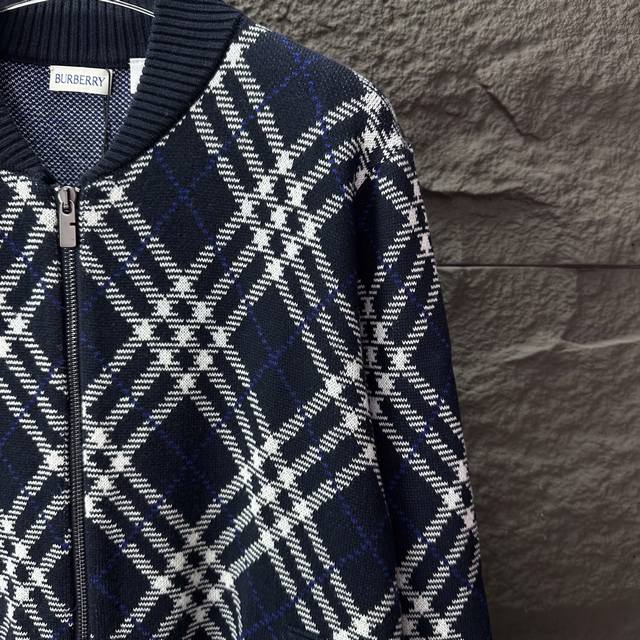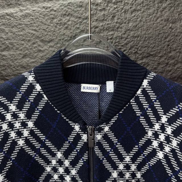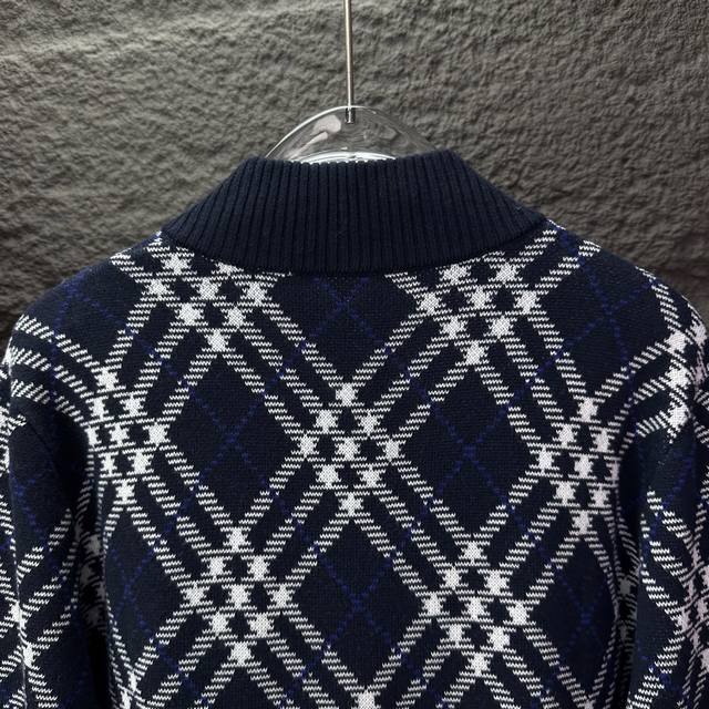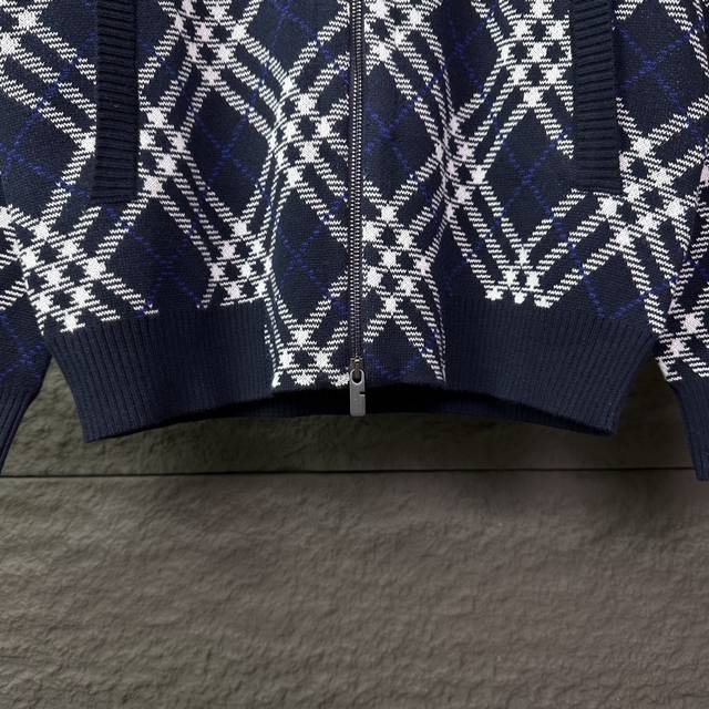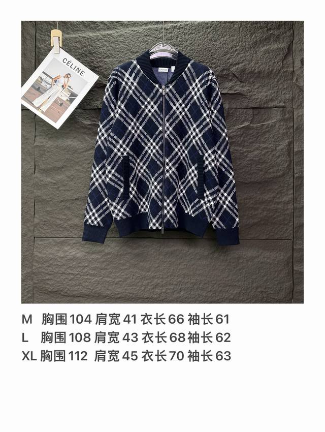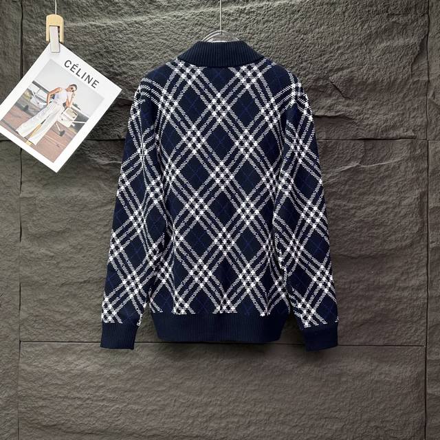 Top-tier version Burberry 2025 new classic diamond pattern couple knitted zip-up sweater cardigan. High-quality fabric made of 32-count cotton blend, skin-friendly and non-irritating, pill-resistant, very soft and comfortable. Stylish and versatile knitted cardigan, suitable for both men and women, a must-have. Complete packaging, tags, neck label, and washing instructions. Color: Navy blue. Sizes: M, L, XL.