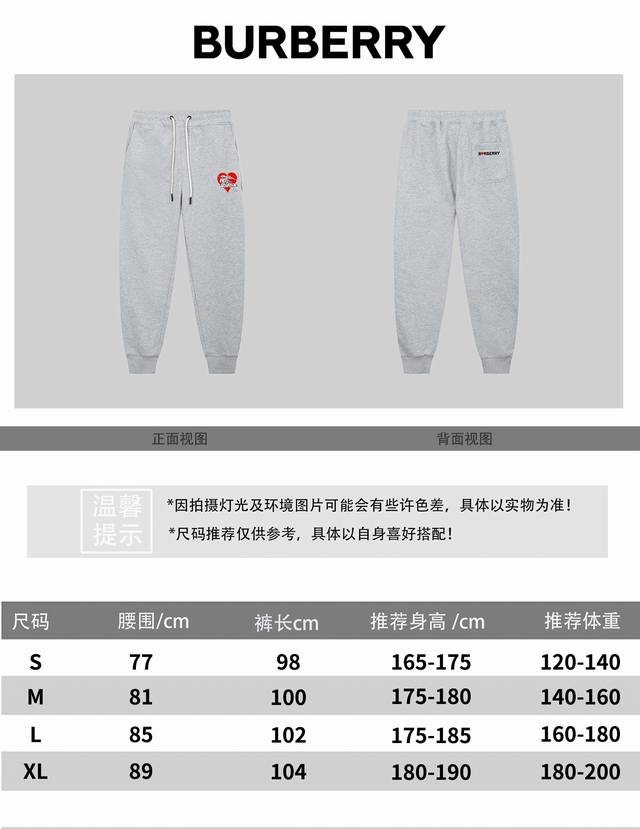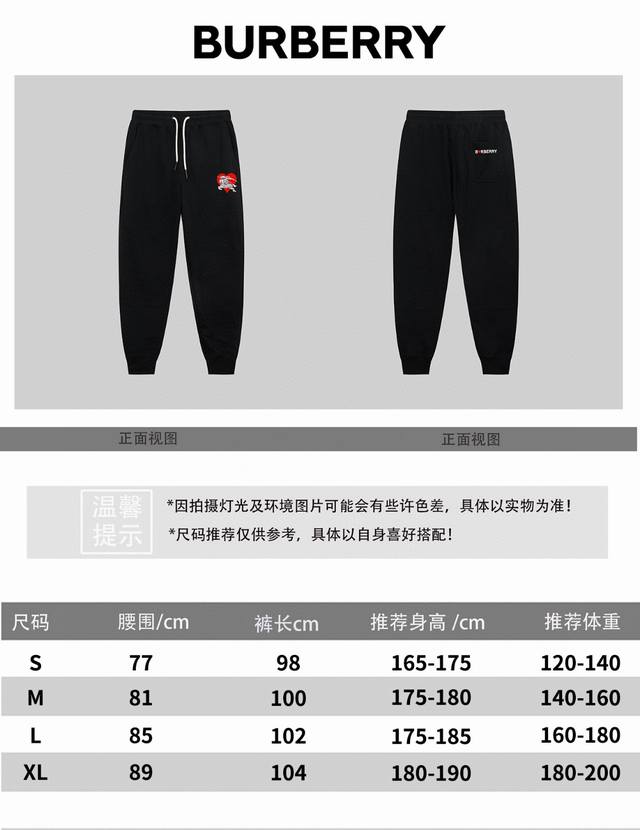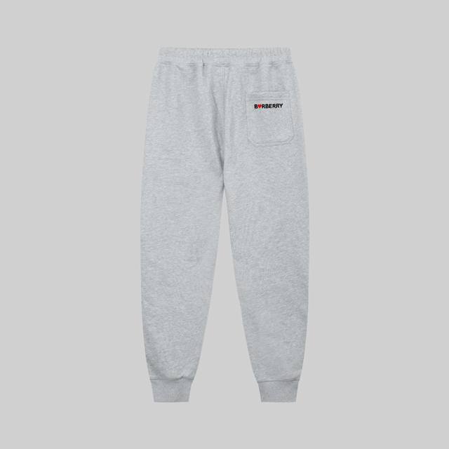 Top-tier version, distinguishing it from regular quality. Burberry Fall/Winter runway slim-fit track pants with minimalist logo and lettering, 380g weight, suitable for all body types. Features include an elastic waistband, black and white drawstring design, custom drawstring pockets, slanted side pockets , and a small back pocket. Colors: Black, Gray. Sizes: S-XL.