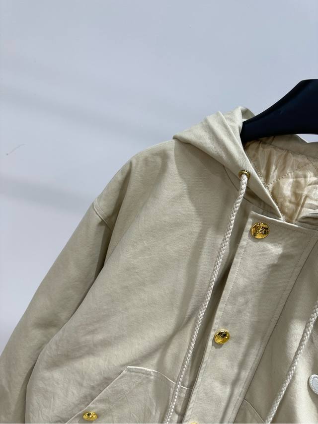 Ce Beige Arc de Triomphe Hooded Jacket, Fabric: Cotton Lining, Color: Beige, Celine 2025 Autumn/Winter Arc de Triomphe Hooded Jacket, Main Color Scheme, High-Quality Soft and Comfortable Fabric, Metal Buttons + Arc de Triomphe Embroidery for High Recognition, Practical Hooded Design, Loose Fit, Layering with Sweatshirts or Knitwear is Great, Easily Creates a Chic and Youthful Look, Suitable for Daily Commute and Leisure, A Must-Have for Autumn and Winter, Stylish and Practical, Easily Enhances the Texture of Your Outfit. Flat Size: S: Shoulder Width 55cm, Chest 120cm, Length 62cm, Sleeve Length 54cm; M: Shoulder Width 56cm, Chest 124cm, Length 63cm, Sleeve Length 55cm; L: Shoulder Width 57cm, Chest 128cm, Length 64cm, Sleeve Length 56cm. Manual measurement may have an error of 2-3cm, which is within the normal range.