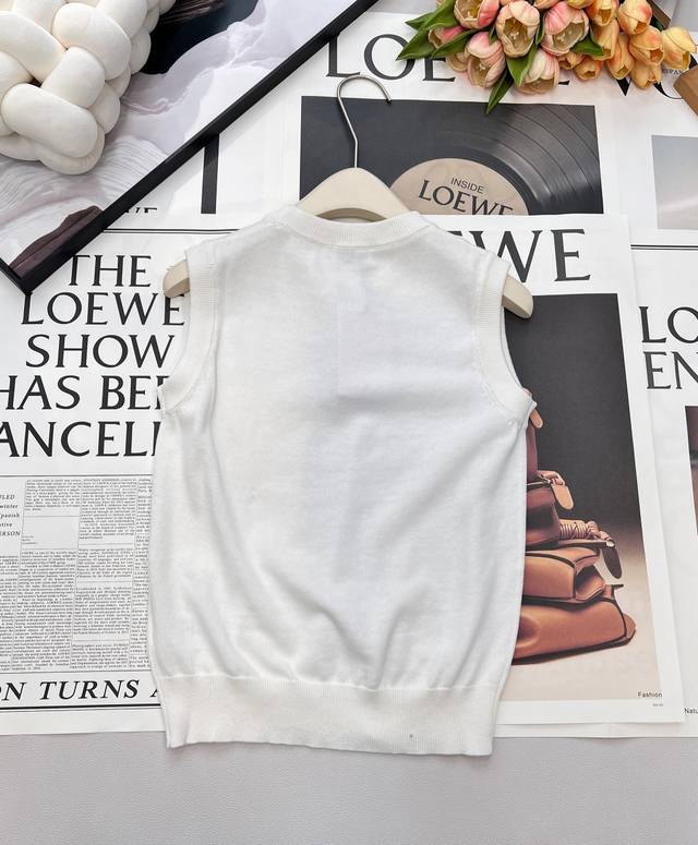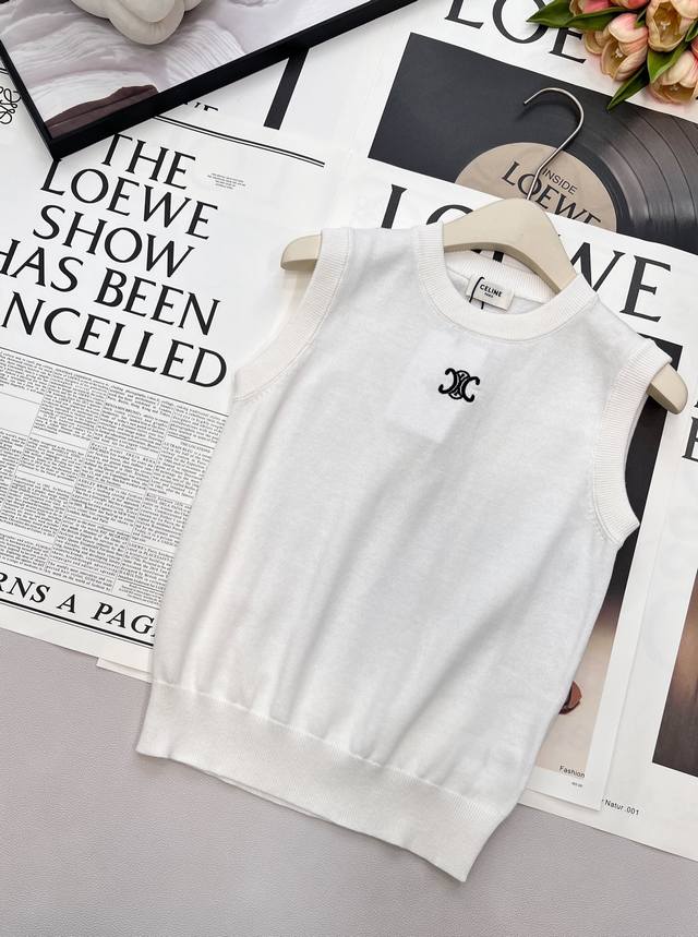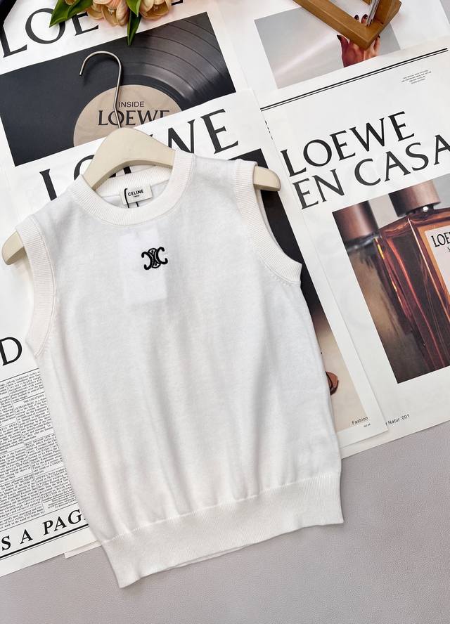 Celine 2025 New Crew Neck Arc de Triomphe Logo Knitted Vest. Made with custom Yb wool yarn, it's comfortable and high-quality. The wide-brimmed pullover knit vest features an embroidered Arc de Triomphe pattern on the chest, highlighting the brand's style. The garment has a fine, dense plain knit, and the ribbed binding adds a touch of elasticity. It's slimming and flattering, perfect for layering in autumn and winter, or wearing alone in spring and summer. A sophisticated and minimalist style suitable for all seasons. Custom fabrics and accessories, all tags included. Available in two colors (Ddd). Sizes: S, M, L, Ddd. Code: E, Ddd.