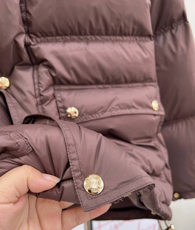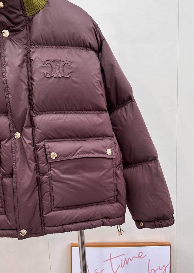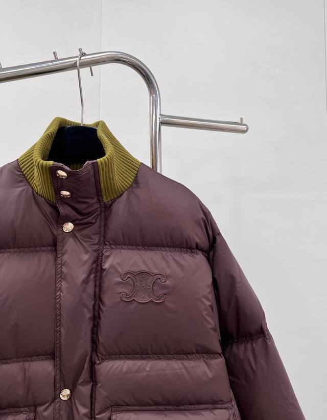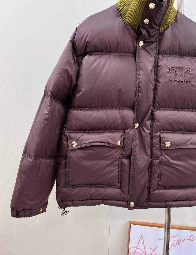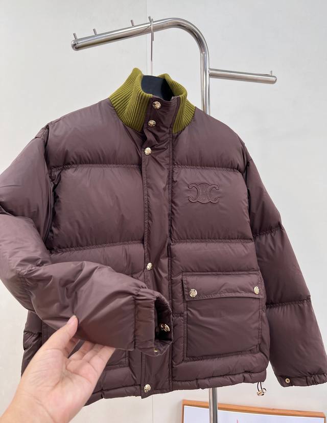Celine 2025 New Stand Collar Down Cotton Jacket, made of custom Yb windproof and waterproof nylon material, with down cotton filling. Lightweight and warm throughout, the collar features knitted ribbed trim and a rectangular embossed pattern. The Arc de Triomphe logo on the chest adds a touch of individuality. Flap pockets showcase fashionable charm. Available in three versatile autumn/winter colors. The zipper and snap buttons provide double security for the opening, ensuring practicality. Easily styled and fashionable, the loose drawstring allows for adjustment. The silhouette is chic and stylish. Custom materials and accessories, complete with labels. High-quality version available. Available in three colors. Sizes: S, M, L, DDD. Code: E, DDD.
