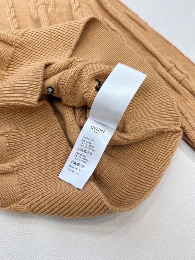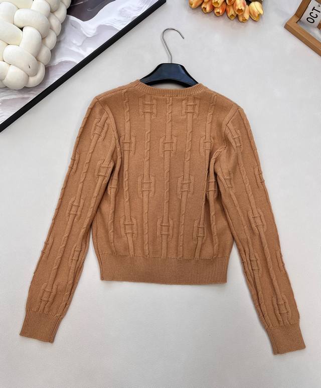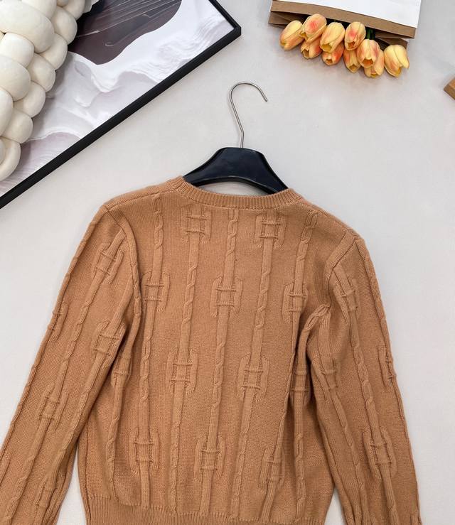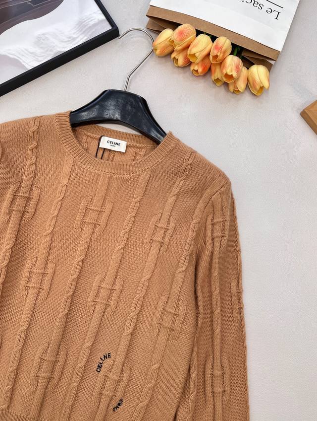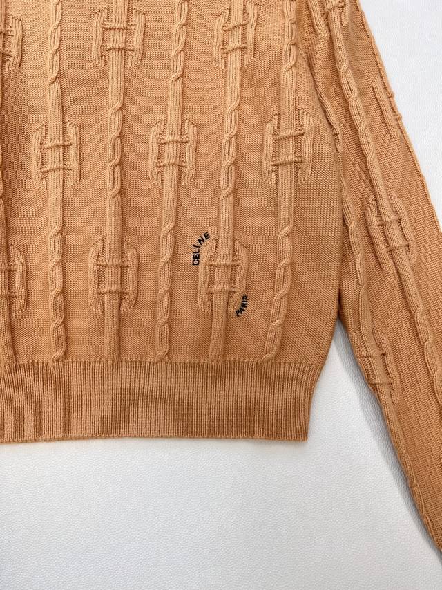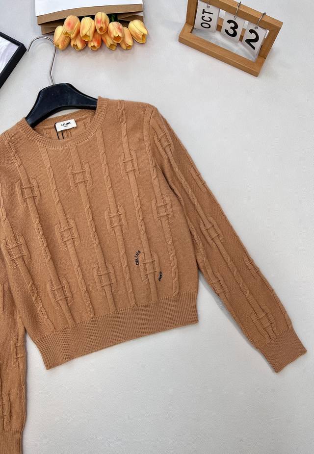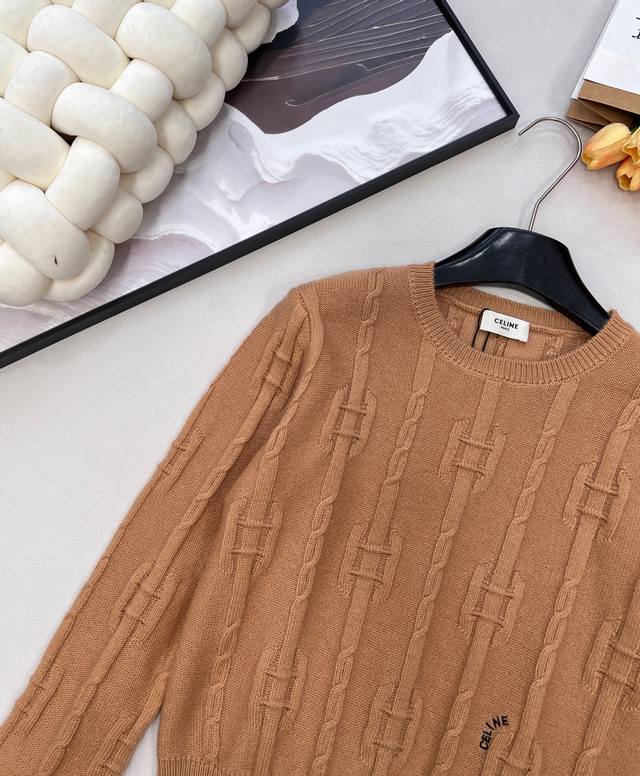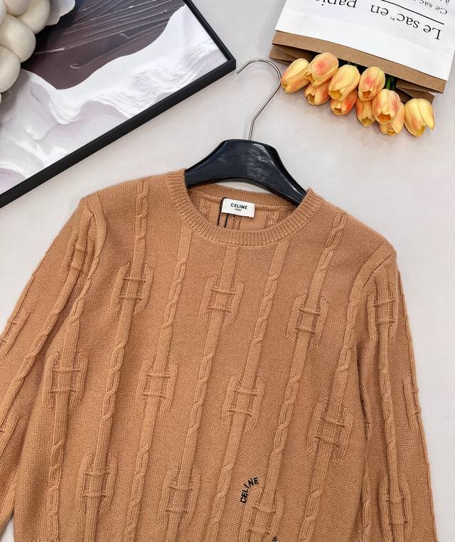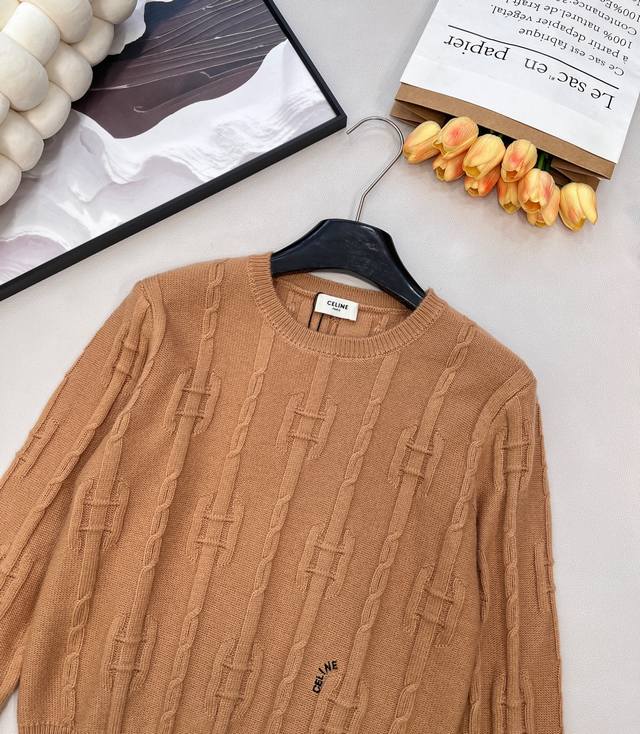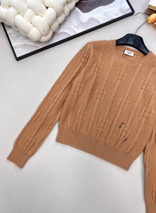 Celinel 2025 New Crew Neck Crochet Letter Pullover Sweater, made with custom Yb wool yarn, high-quality texture, comfortable and soft. Crew neck, long sleeves, dense knit for warmth and wind protection. Vertical ribbed trim on the neckline and cuffs echoes the hem. Vertical chain square buckle on the body, single-sided letter logo on the hem, adorned with the word "Paris," showcasing a high-end positioning and fashionable style. Regular fit with structured shoulders, available in three colors, creating an autumn/winter feel, making the style more timeless and versatile. All tags are complete. Bulk orders available in all three colors. Sizes S, M, L, DDD. Code E, DDD.
