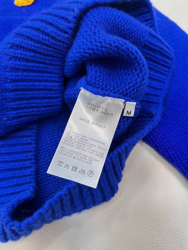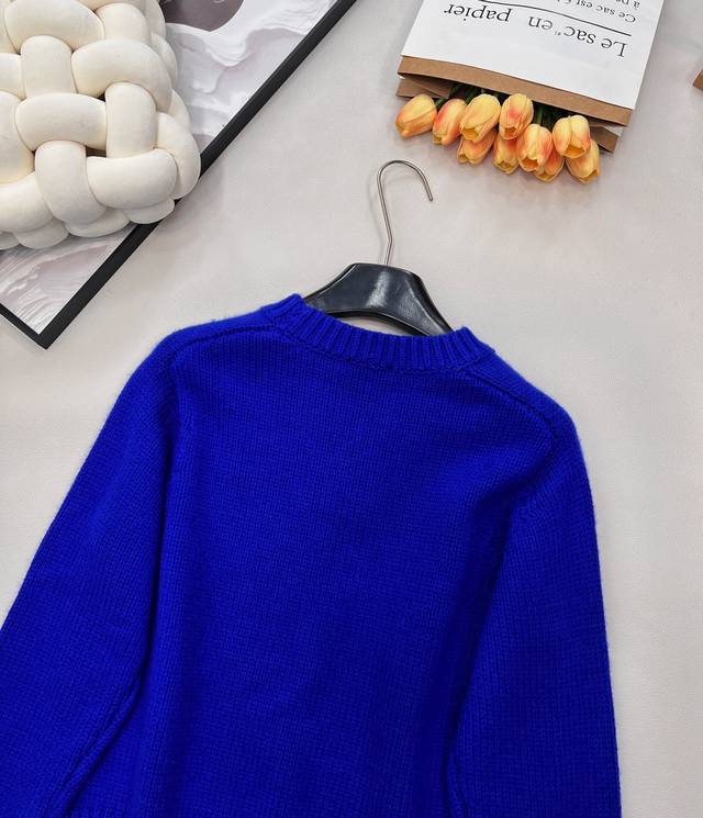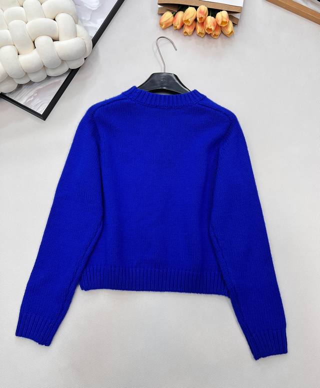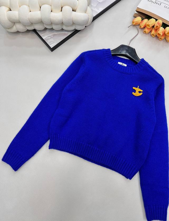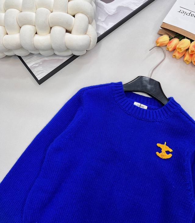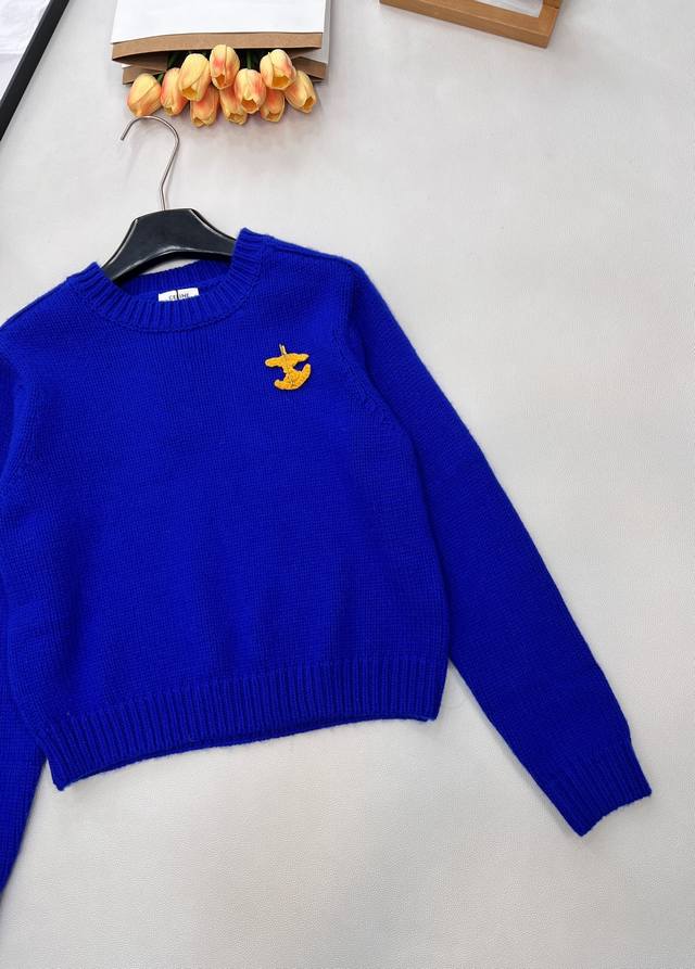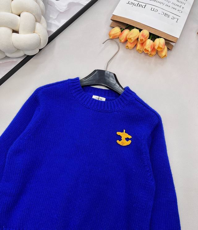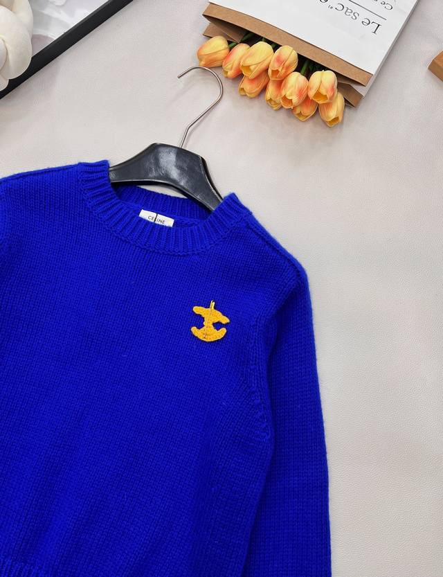 Celine's new Arc de Triomphe 2025 Fall/Winter slimming and versatile sweater. The pattern on the chest of this wool knit sweater can be detached and DIY'd onto any garment. Exquisite and stylish! The blue sweater paired with a colorful crocheted brooch looks beautiful hanging there. The material is very soft and the deep blue is a perfect match. The white sweater paired with a red brooch is a versatile and perfect color combination. The knit texture is delicate and soft, so comfortable to wear that you'll want to stay glued to your body. The cropped style is super flattering for petite figures, easily creating a 3:7 proportion. All three tags are included. Available in two colors. Sizes S, M, L. Code E.