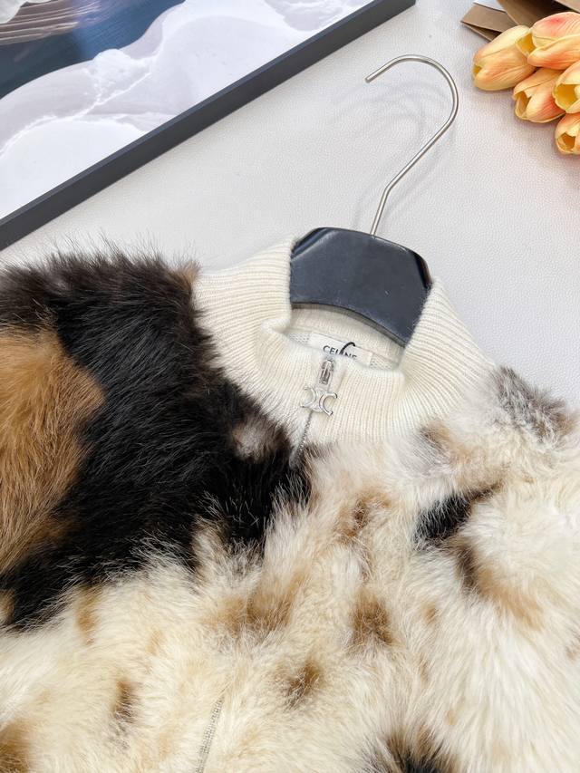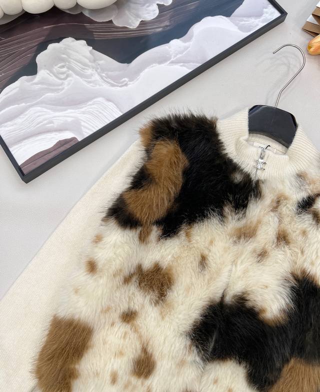 Celine's new shearling cardigan features a luxurious blend of fur and knit. The logo on the back subtly identifies the brand, while the front combines mottled fur with knit in contrasting brown, black, and off-white colors, creating an artistic effect. The brand's metal logo at the zipper adds a touch of sophistication. Turning around, the letter logo on the back subtly reveals itself, cleverly concealing brand recognition within the styling details. The interplay of the warmth of knit and the luxury of fur allows it to be both a statement piece in streetwear and a sophisticated accent in elegant outfits, easily adapting to various styles. It's the perfect eye-catching piece to make you stand out this winter. All tags are complete. Bulk order available. Sizes S, M, L, DDD. Code E, DDD.