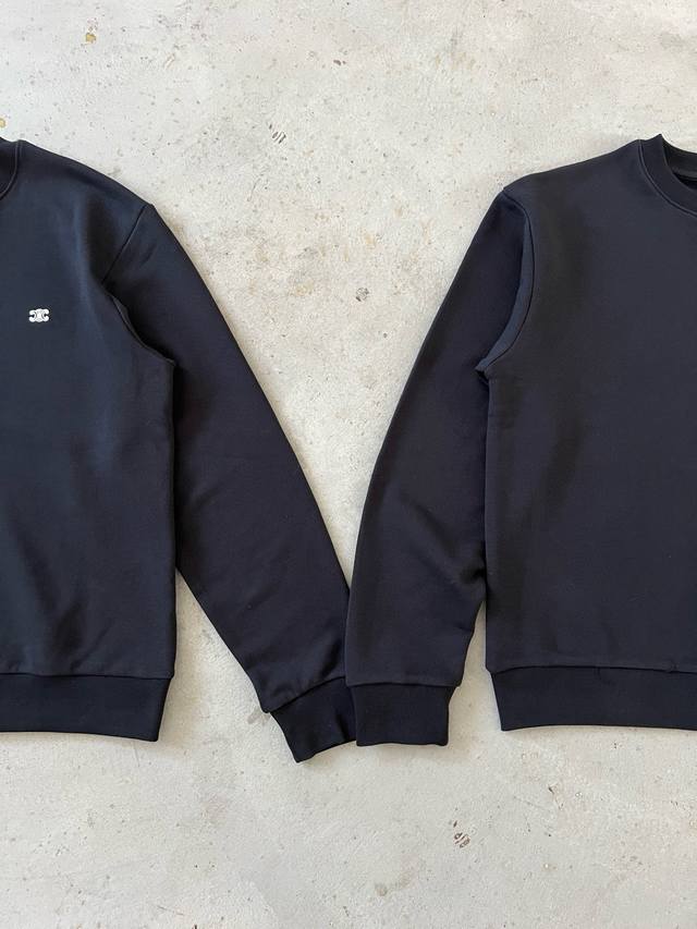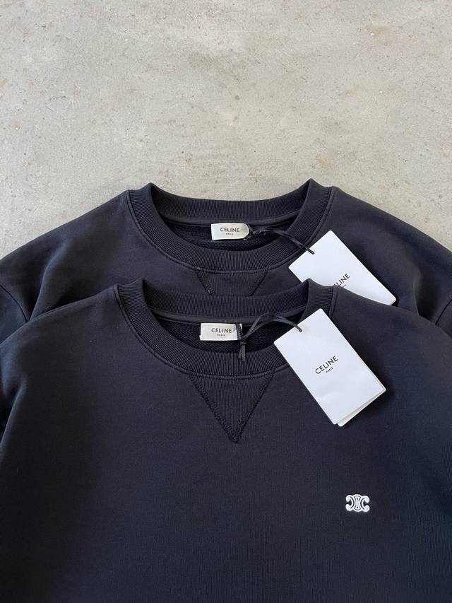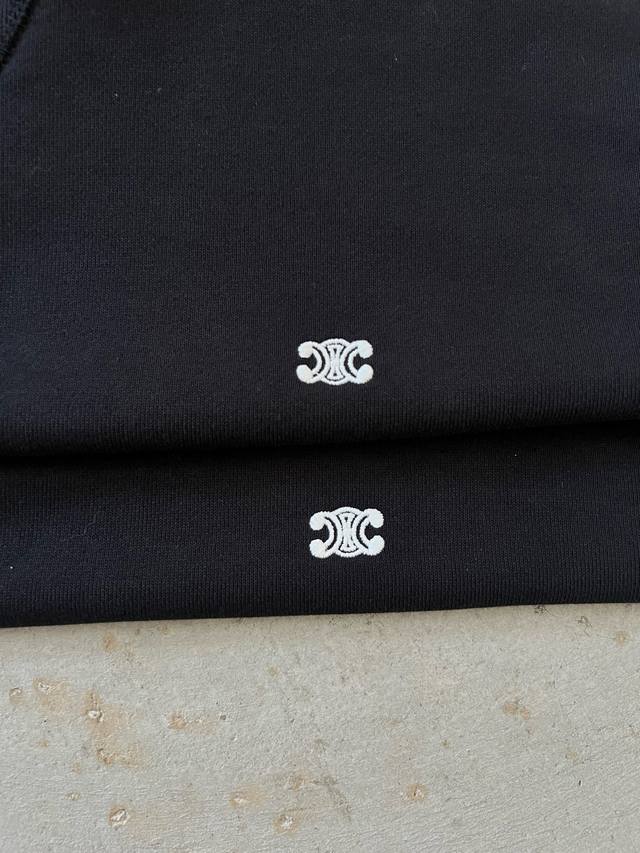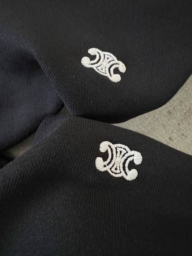 conveys French refined aesthetics! The 2025 Autumn/Winter new roundel neck sweatshirt with a small double-C embroidered logo on the chest. When a brand's influence reaches the pinnacle of fashion, high-end design never needs flashy embellishments; the simple and exquisite brand logo alone can express all the style. The everyday loose cut, the versatile elegance of pure black, and the luxurious texture are all there. The small Chain Blason embroidered logo on the chest, featuring the Arc de Triomphe double-C chain pattern, is classic and timeless, symbolizing Celine's craftsmanship and high standards. It's easy to match and exudes elegance, full of understated charm, adding a touch of sophistication to both high-street fashion and luxurious occasions. 430g cotton terry cloth, custom