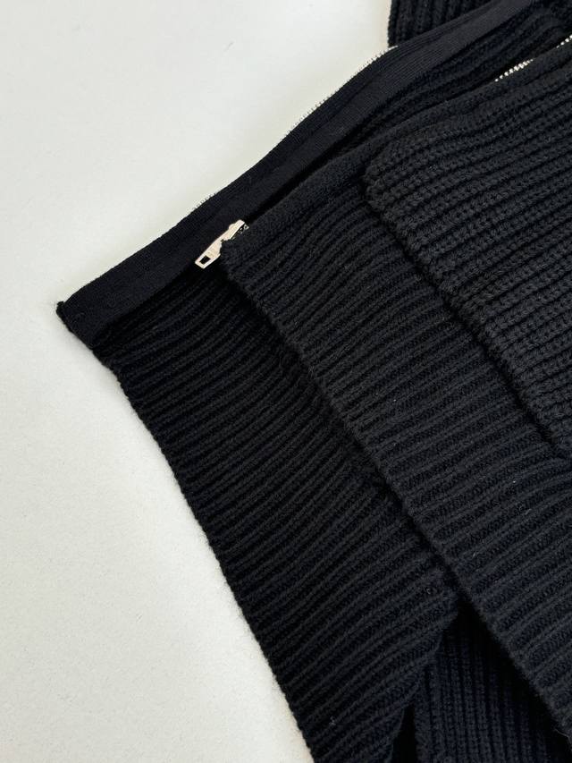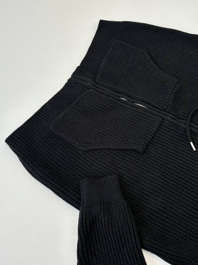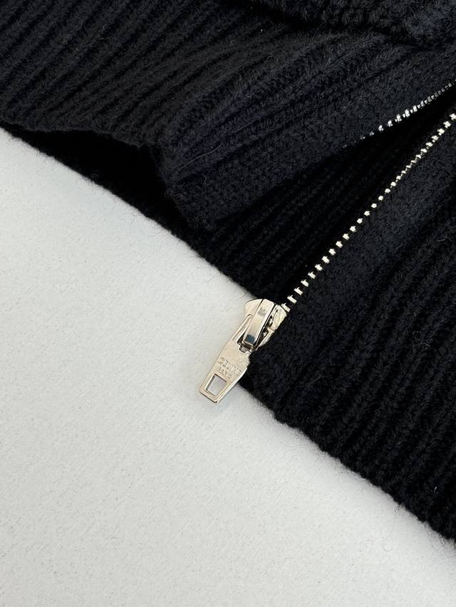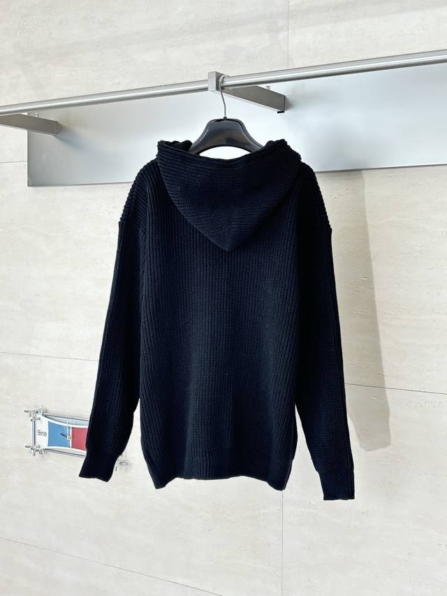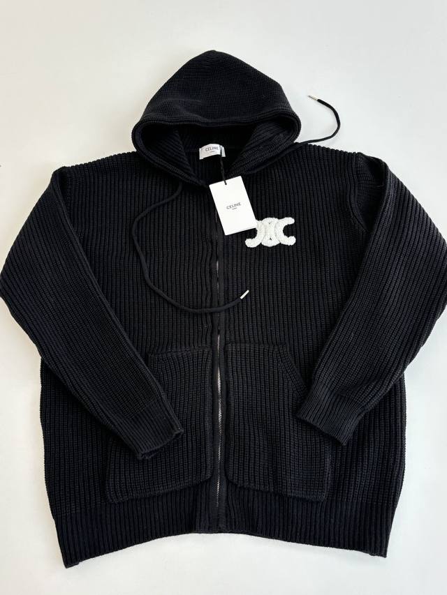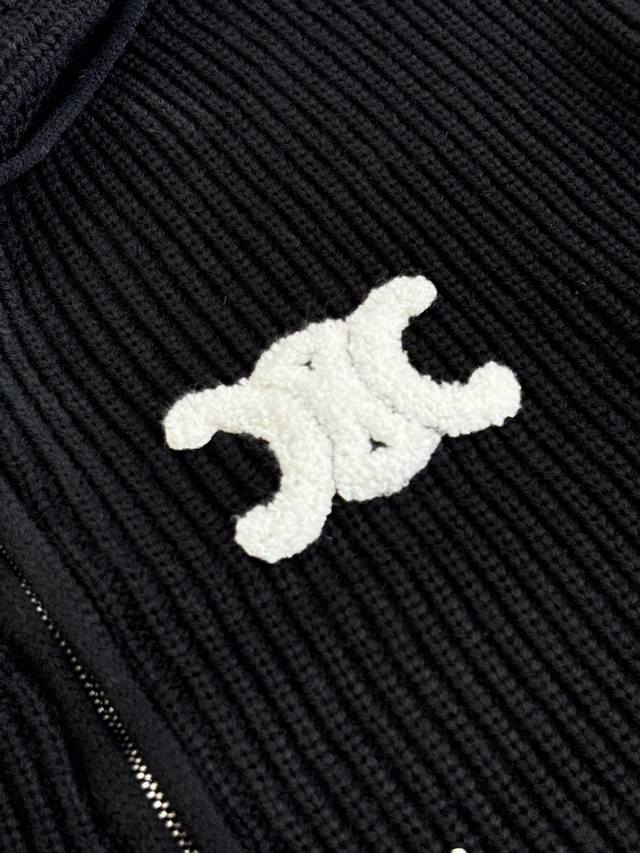 Celin* Celine Embroidered Logo Knit Hooded Zip-Up Jacket DDD. The fabric is made from 55% Merino wool yarn blended with cotton yarn. This fabric results in a structured silhouette, a smooth feel, and a comfortable, non-irritating texture. The hood drawstring clip features an electroplated engraving of the brand logo. The zipper uses a bright silver electroplated pull with the brand logo engraved on the surface. The embroidery employs a towel embroidery technique, using cashmere yarn to achieve a 1:1 replica of the original details. The garment undergoes a washing process to remove surface impurities from the wool, enhance the feel, and solidify the shape. DDD Size: SML DDD