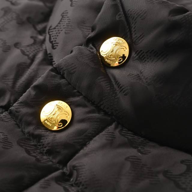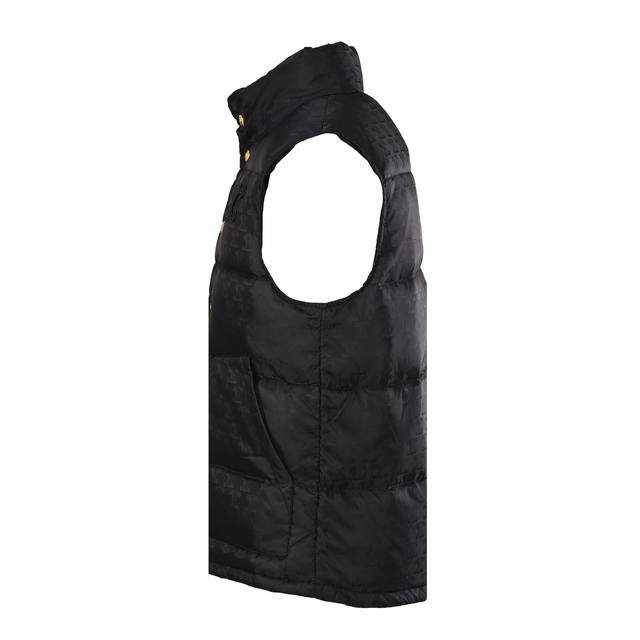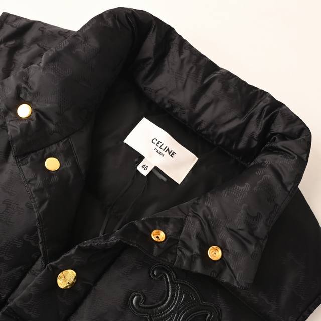 Celine Arc de Triomphe Pattern Down Vest (Ddd) The fabric undergoes a special treatment, providing excellent wind and water resistance, offering effective protection in harsh weather and ensuring the wearer's warmth and comfort. Advanced laser jacquard technology creates a textured surface with a strong three-dimensional effect, enhancing the garment's unique visual appeal. Filled with 90% white duck down with a fill power of 700, it ensures superior warmth. The filling undergoes rigorous selection and processing to minimize down leakage, guaranteeing comfort and durability. The stand-up collar and elastic cuffs provide effective wind protection and warmth, enhancing practicality. Hardware accessories, such as zippers, are custom-made to order, using tungsten alloy, with exquisite details and durability. The clear, delicate jacquard pattern and rich, even colors showcase Celine's profound understanding and pursuit of fashion and aesthetics. The overall stitching is smooth, with even stitches and no loose threads or frayed edges . Size: 46 48 50 DDD