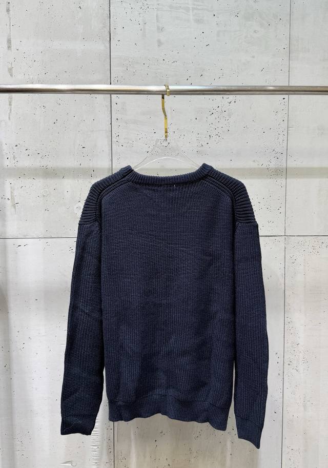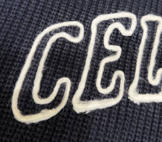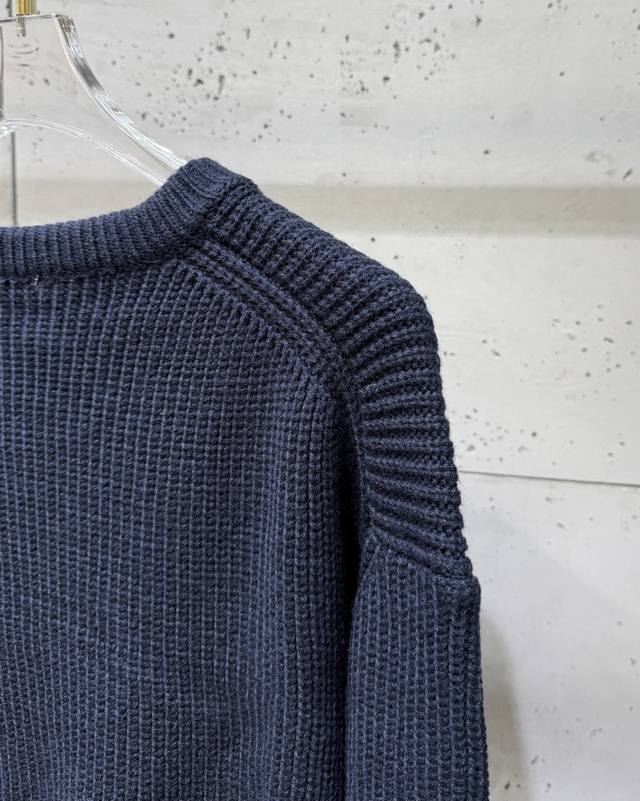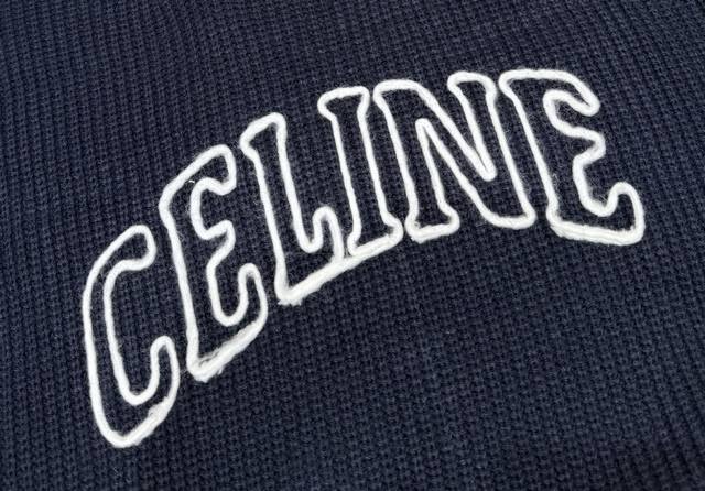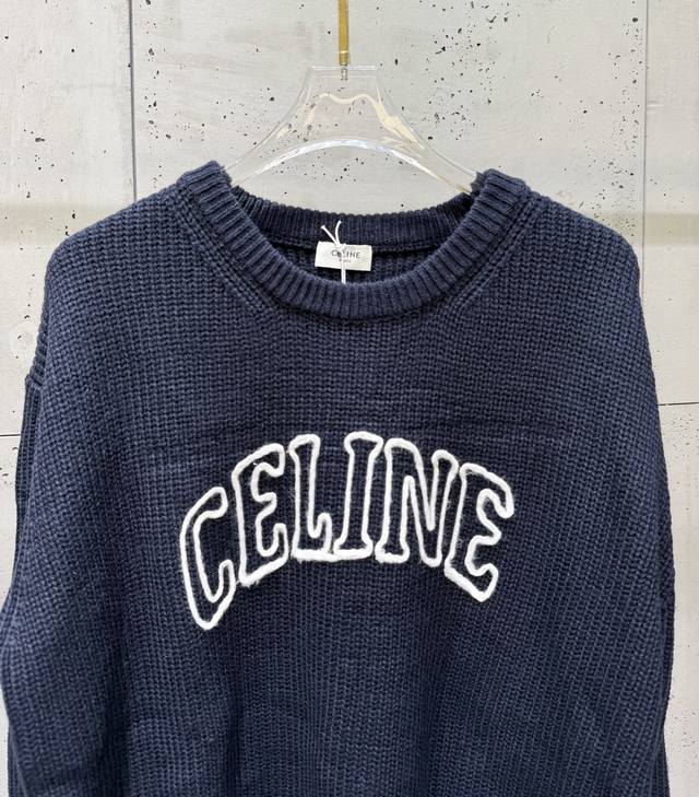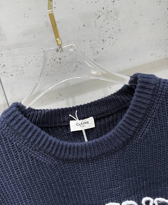 Celine Crew Neck Sweater with Hollow-out Embroidery. Originally purchased for 11,500. Made with 100% pure wool yarn, it's incredibly soft and comfortable against the skin, weighing 700 grams. Woolen with imported Stroll yarn, the texture is clear. It features a 7-needle double garter stitch. The front is embroidered using a high-density Behringer machine, and the lettering is laser-embroidered with wool microfiber, combining the natural softness of wool with the durability of microfiber. The laser beam precisely embroiders the lettering in designated positions, resulting in highly accurate embroidery. The lettering lines are smooth and the edges are clear. After embroidery, it must be washed and felted to ensure a better match with the garment. Most sweaters on the market use thin felt embroidery that cannot be washed. All three tags and accessories are included. The sweater has a relaxed fit, unlike other versions on the market. Sizes: S, M, L.