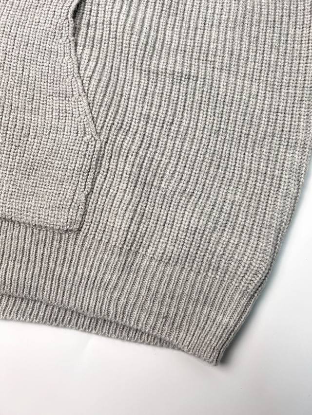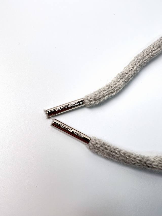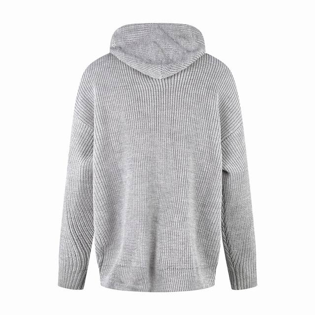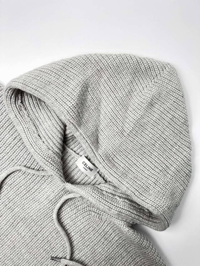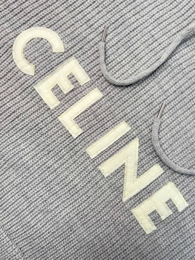 Celine Hooded Pullover Knit Sweater. Made of custom-designed, luxurious, soft, and bulky wool fleece, this sweater is thick, sturdy, comfortable, and skin-friendly. The main color is a sophisticated gray, creating a hazy yet profound and exquisite look. The Celine letter embroidery on the front instantly brightens the entire design, making it highly recognizable. The novel design of this knit sweater paired with a pullover adds a touch of casualness and freedom, creating countless styling possibilities. Process 1: Laser embroidery is used for the letter embroidery. High-energy laser beams are used for precise cutting and embroidery on the fabric. Precise control of the laser beam ensures that every detail of the embroidery is perfect. Process 2: The letter material uses wool microfiber for positioning laser embroidery. Combining the natural softness of wool with the durability of microfiber, the laser beam is used to precisely embroider in designated positions, achieving a highly accurate embroidery effect. The letter lines are smooth and the edges are clear. Process 3: Garment washing and softening/deodorizing process. Professional washing equipment and specific detergents are used to deeply clean and deodorize the garment, improving its feel and appearance. Accessories: Custom 1:1 Celine logo white asphalt alloy clip, custom-woven and dyed 100% cotton textured round rope, custom 1:1 Celine logo. Fit: Loose fit. Sizes: Xs, S, M, L.