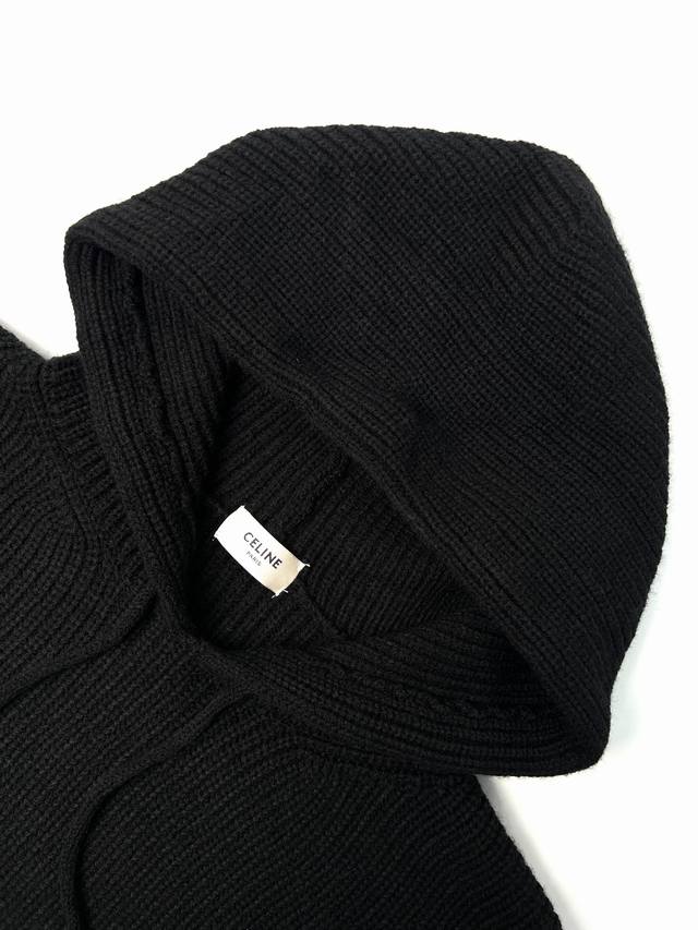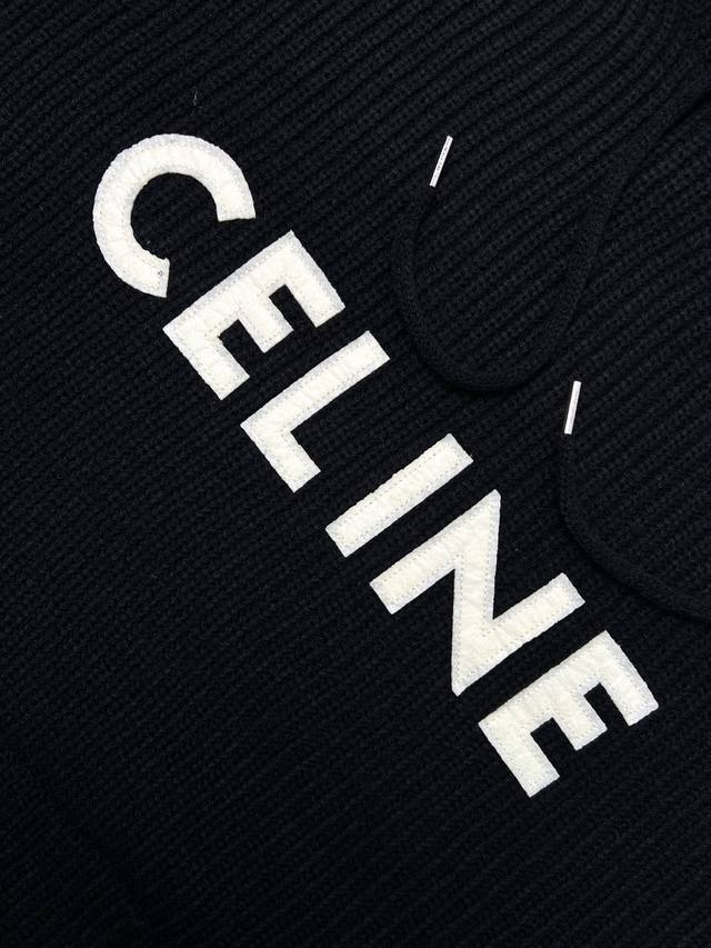 Celine Hooded Pullover Knit Sweater. Made of custom-designed, luxurious, soft, and plush wool blend, this sweater is thick, sturdy, comfortable, and skin-friendly. The classic black color scheme perfectly blends elegance and sophistication. Exquisite Celine letter embroidery adorns the front, instantly brightening the entire look and making it highly recognizable. The novel design of this knit sweater paired with a pullover adds a touch of casualness and freedom, creating countless styling possibilities. Technique 1: Laser embroidery is used for the letter embroidery. High-energy laser beams are used for precise cutting and embroidery on the fabric. Precise control of the laser beam ensures that every detail of the embroidery is perfect. Technique 2: The letter material uses wool microfiber for positioning laser embroidery. Combining the natural softness of wool with the durability of microfiber, the laser beam is used to precisely embroider in designated positions, achieving a highly accurate embroidery effect with smooth letter lines and clear edges. Technique 3:: The garment washing and softening deodorizing process uses professional washing equipment and specific detergents to deeply clean and deodorize clothing, improving its feel and appearance. Accessories: Custom 1:1 Celine logo white asphalt alloy clips; custom-woven and dyed 100% cotton textured round rope; custom 1:1 Celine logo. Fit: Loose fit. Sizes: Xs, S, M, L.