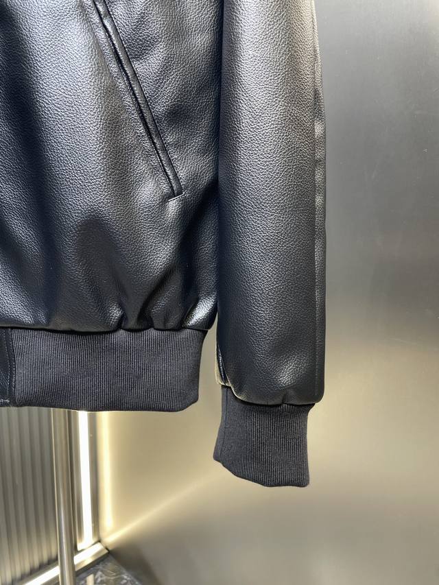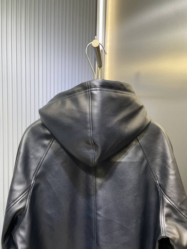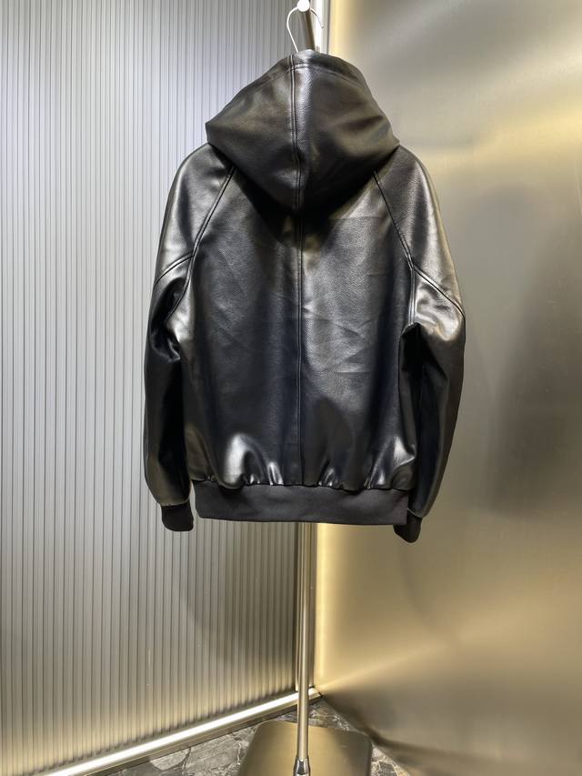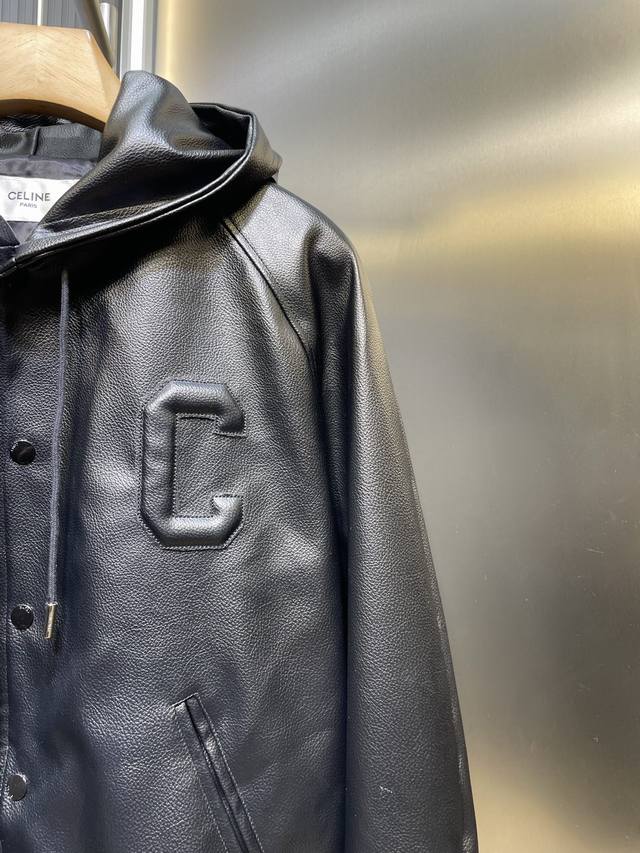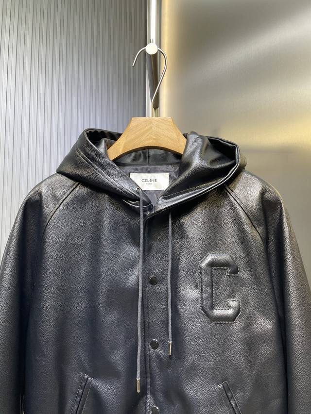 Celine Leather Hooded Jacket. Made with custom-finished premium leather and Tencel lining, this jacket boasts a warm, lustrous sheen. Adorned with the iconic Celine "C" logo, the front showcases the brand's consistent elegance and style. The black base exudes a luxurious and sophisticated feel, with every inch radiating a subtle yet captivating sheen. The hood adds a touch of style, making it versatile and suitable for various looks. Craftsmanship 1: Laser 3D Contour Precision Cutting. Advanced computer laser technology is used to precisely cut the "C" outline from the leather. The elasticity and support of the sponge pads assist in the embroidery stitching, creating a three-dimensional and layered embroidery effect. Craftsmanship 2: Double-Sided Adhesive Bonding. Precise cutting and positioning ensure the sleeves remain flat and fitted even when bent, guaranteeing a tight, seamless fit. This is all to achieve the same effect as the original leather jacket. Craftsmanship 3: Advanced infrared positioning technology ensures precise craftsmanship of the snap fasteners, with neat and uniform letter arrangement and consistent direction. Process 4: Template machine uses a pre-set template to guide the opening position, shape, and size, ensuring high-quality opening results. Accessories: Custom 1:1 Celine letter pendant, Custom 1:1 Celine letter snap fastener, Custom 1:1 Celine logo. Fit: Slim fit. Sizes: 46, 48, 50, 52.