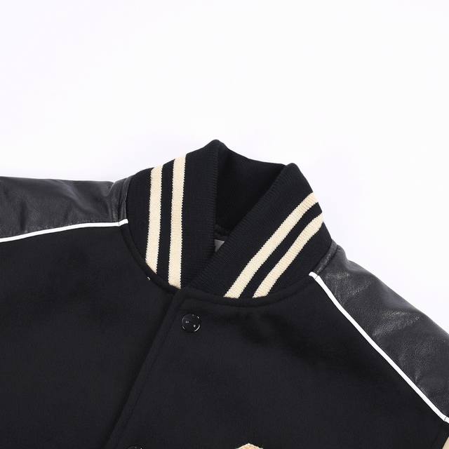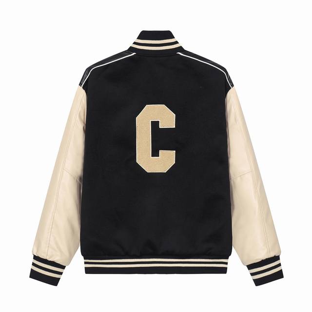 Celine Teddy Baseball Jacket with Large C Embroidery and Leather Patchwork. This cashmere and leather baseball jacket has a structured and stylish cut. The small stand-up collar is also a favorite. It feels very comfortable to the touch. The ribbed cuffs are all custom-made using a knitting machine. The back features exquisite embroidery. It looks great on and is easily worn by both men and women. Colors: Black, Green. Sizes: Xs, S, M, L.