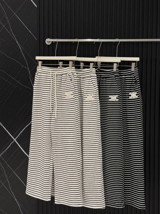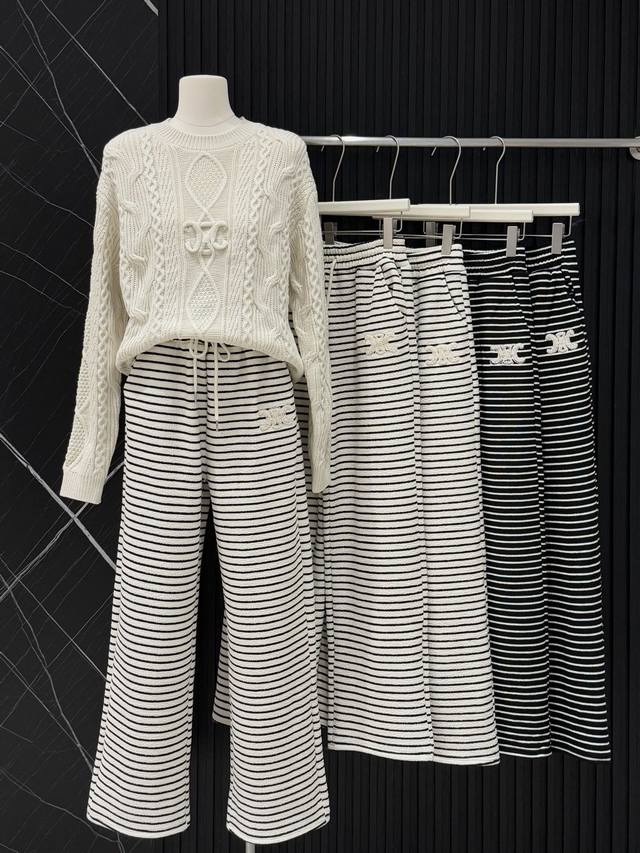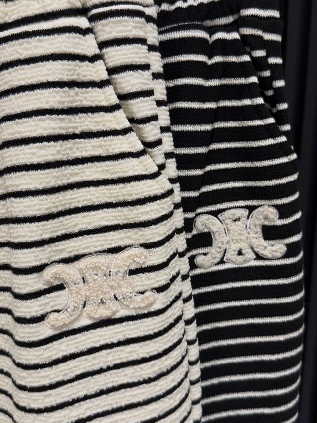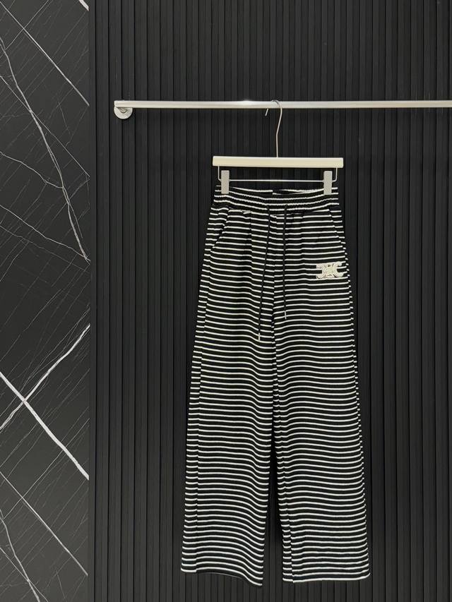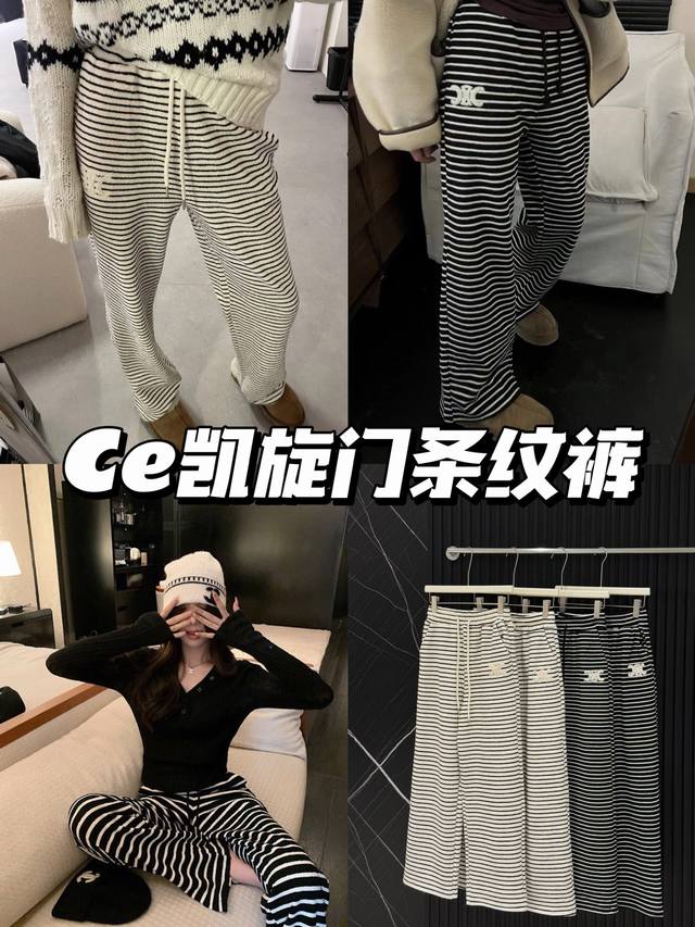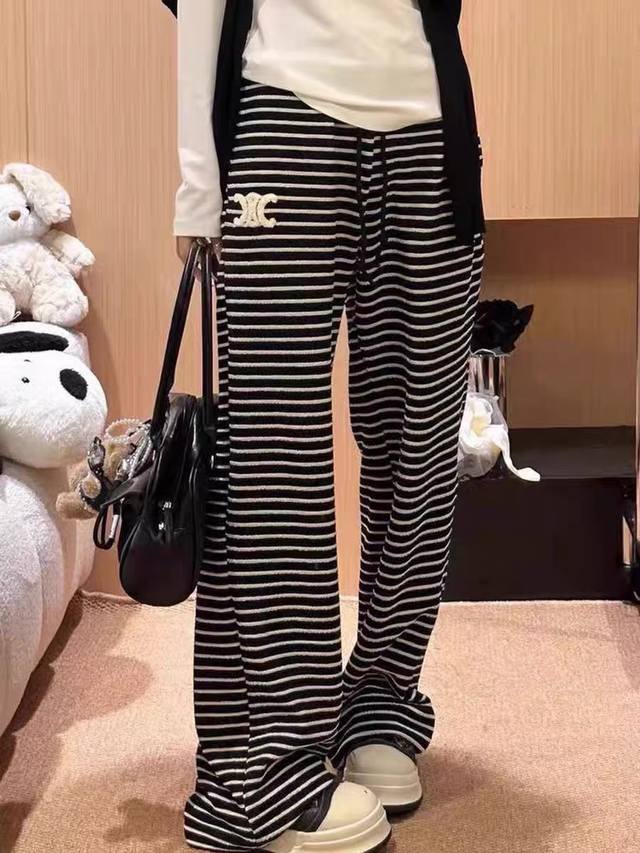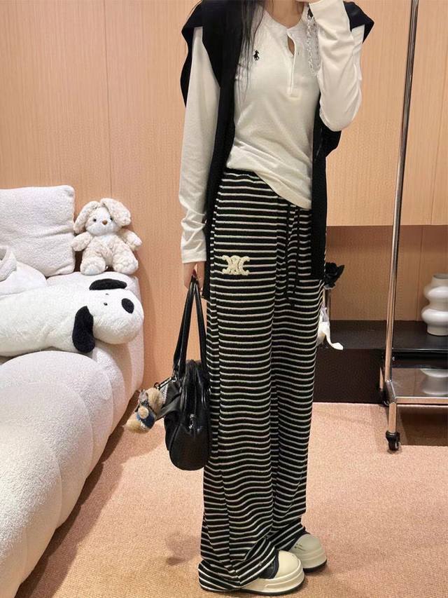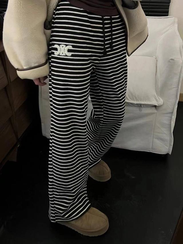 High-end fleece-lined Celine Arc de Triomphe striped wide-leg pants. The fit is a relaxed, wide-leg style, flattering for most leg shapes. The striped design visually conceals the hips and enhances proportions. The family-sized version is warm, comfortable, and slimming