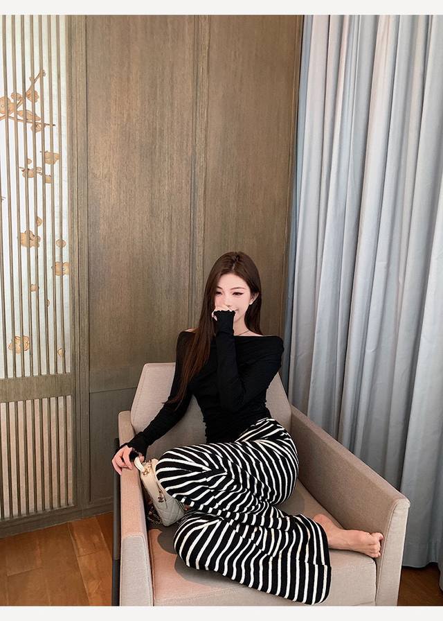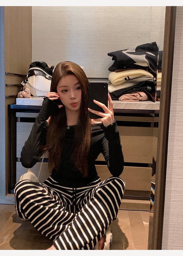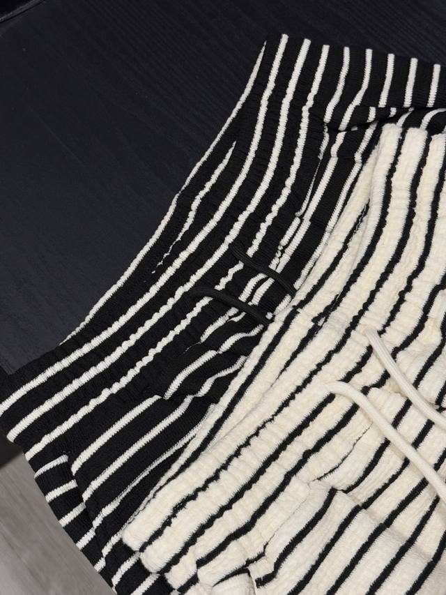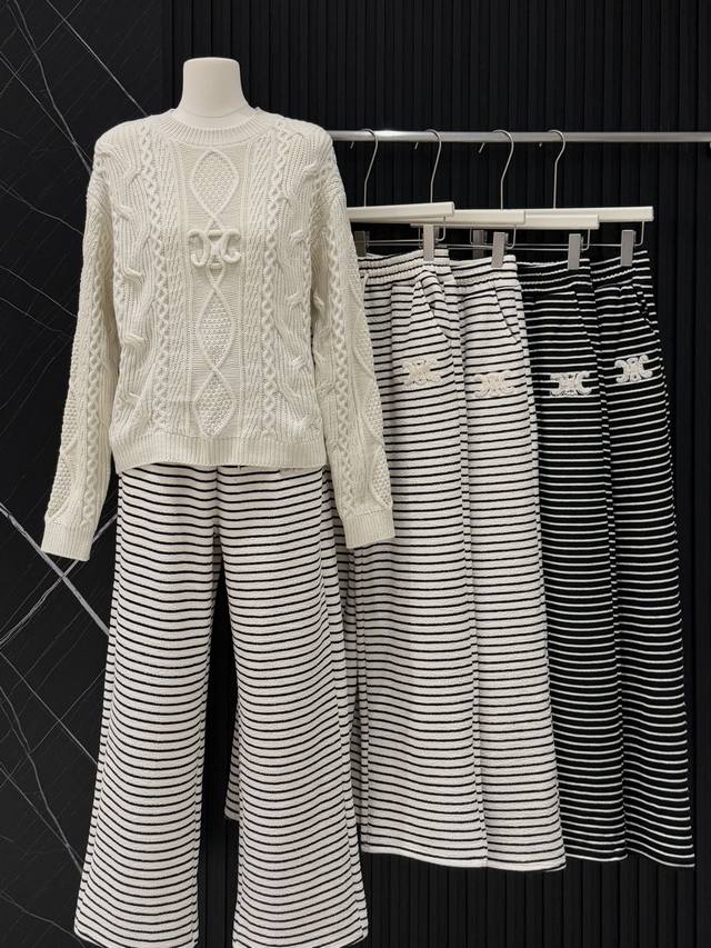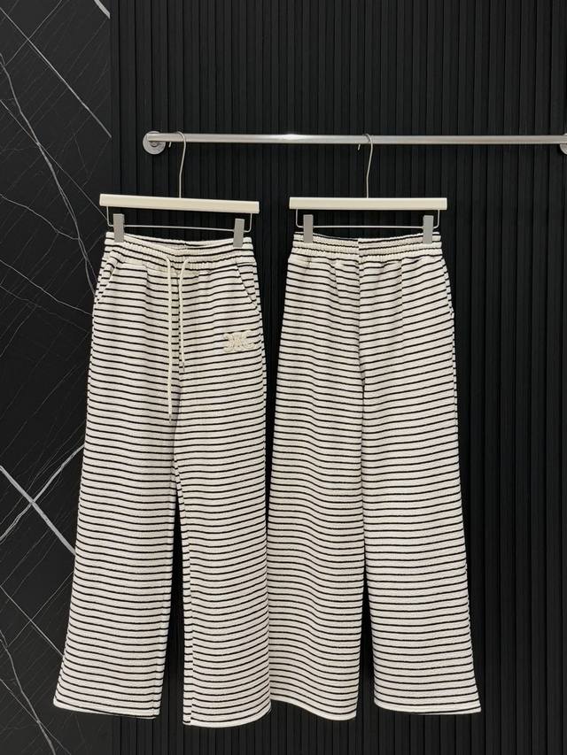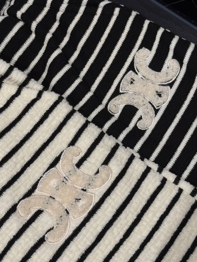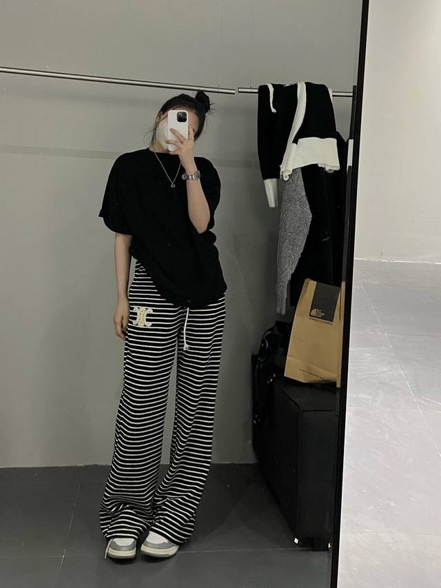 High-end fleece-lined Celine Arc de Triomphe striped wide-leg pants. The fit is a relaxed, wide-leg style, flattering for most leg shapes. The striped design visually conceals the hips and enhances proportions. The family-sized version is warm, comfortable, and slimming