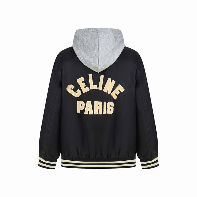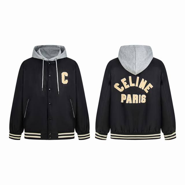 New Arrival: Celine 23Fw Hooded Baseball Jacket (DDD). Originally purchased for 15,800. Features double-layered fabric: the outer black fabric is satin technical fabric, with custom terry cloth embroidery patches on the front and back panels, laser-cut lettering, and made using an imported Tajima embroidery machine. The hood and lining are 100% cotton with a thin inner quilting. The ribbed weave uses two colors of yarn, and is woven on a flat knitting machine. Produced in a top-tier factory, quality is comparable. Unisex style. A treasure of a Hedi Slimane masterpiece, worthy of collection. Distinguish from the white ribbed version on the market. DDD Size: Xs SML DDD