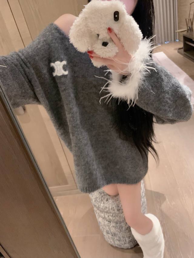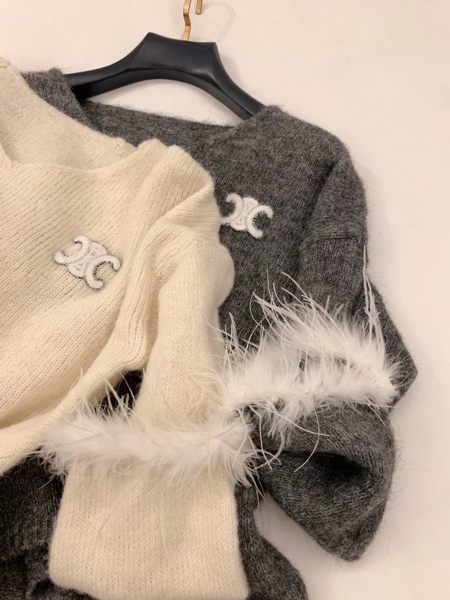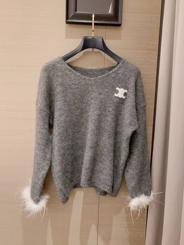 New Arrival: Celine 25. New Arrival: Arc de Triomphe Cuff Fur V-Neck Sweater. Colors: Grey/Apricot. Sizes: S, M, L. S Recommended Size: 80~ M Recommended Size: ~115 L Recommended Size: 115~135