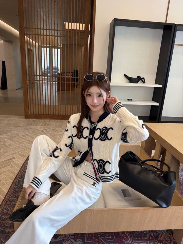 Celi* Celine Arc de Triomphe custom button knitted sweater straight slim pants suit