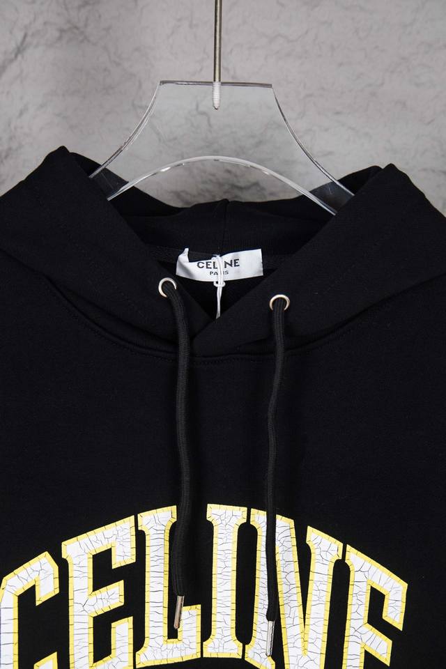 Style No.: M261 Celine Crack Print Hoodie. Made with 400g double-strand fish-scale fleece fabric, featuring 2*2 trendy rib knit. The chest area is printed with a crackle pattern using a plastisol ink, creating a natural yet irregular crackle effect. The thickness of the plastisol coating and the drying temperature and time require very precise control to achieve the best crackle effect. Custom accessories included. Loose fit. Size: S-XL.