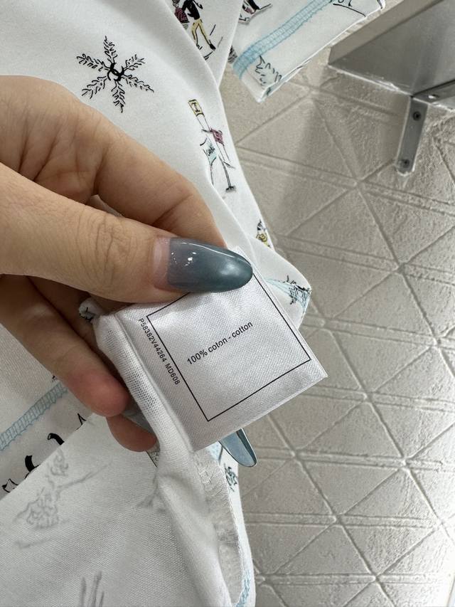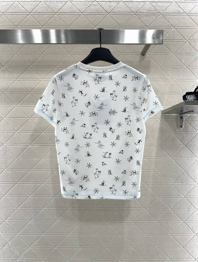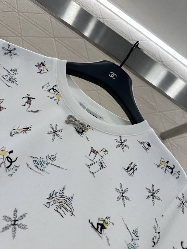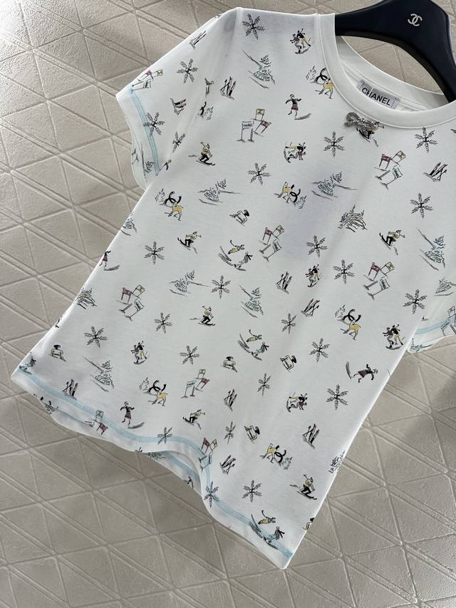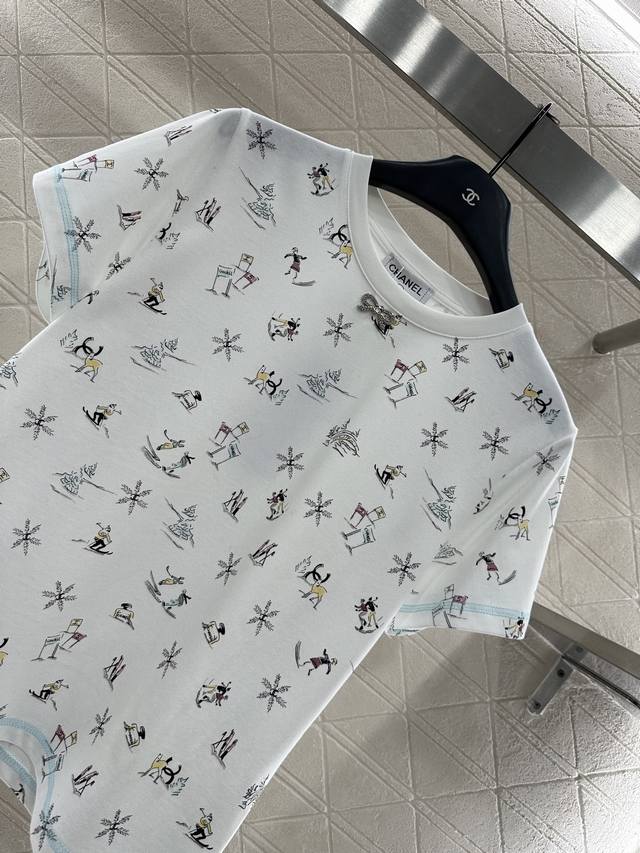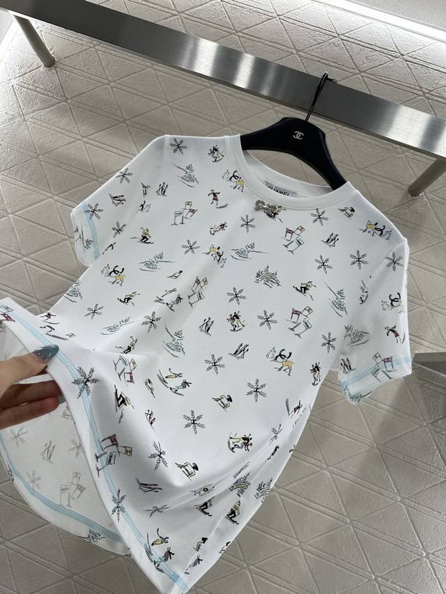 Chane* 2025 New Arrival DDD Crew Neck Printed Short-Sleeve T-Shirt DDD 25 Ski Series #Custom Yb twill cotton, comfortable texture, excellent elasticity, regular crew neck short-sleeve top cut, adorned with a rhinestone bow logo in the center of the chest, all-over print of ski snowflakes and other winter ski resort elements, incorporating double C logo print to highlight the brand style, blue and white accents for a refreshing look, excellent elasticity and fit, visually slimming and elongating, flattering and stylish whether worn alone or as an inner layer. Custom fabric and accessories, please look for high-quality version 34 36 38 DDD