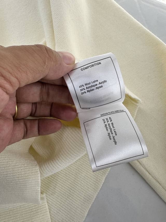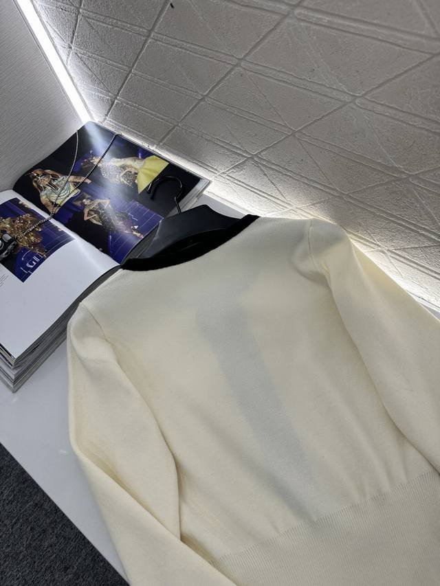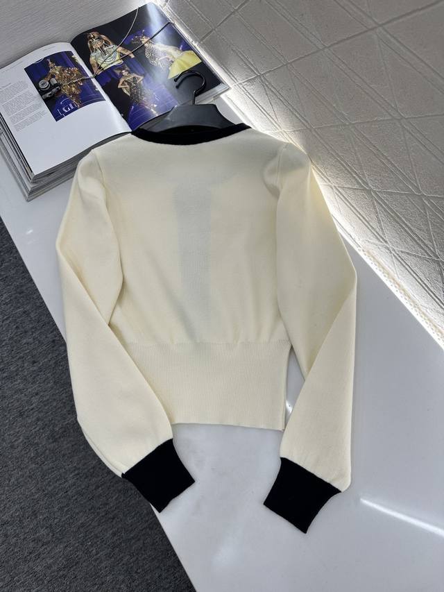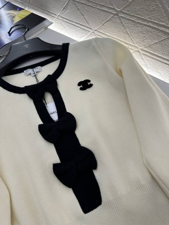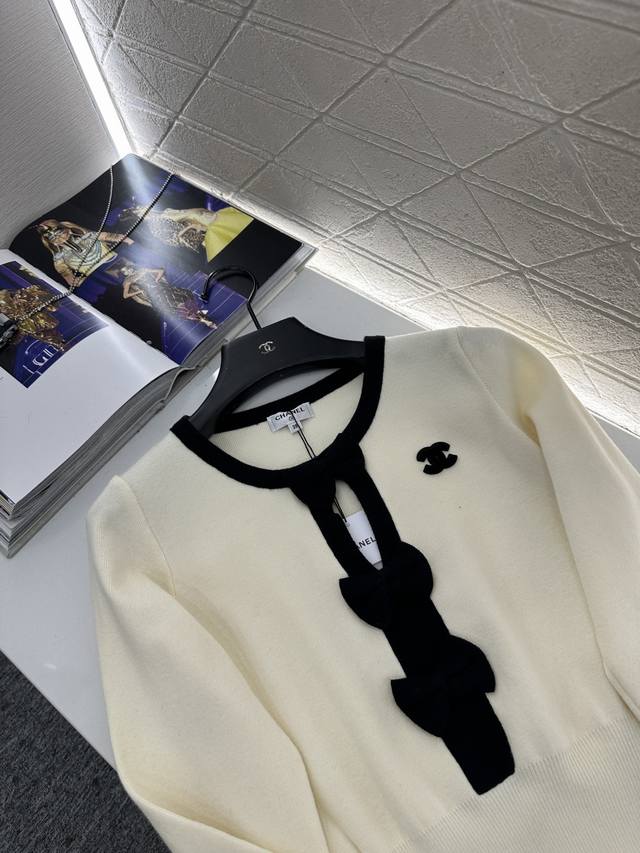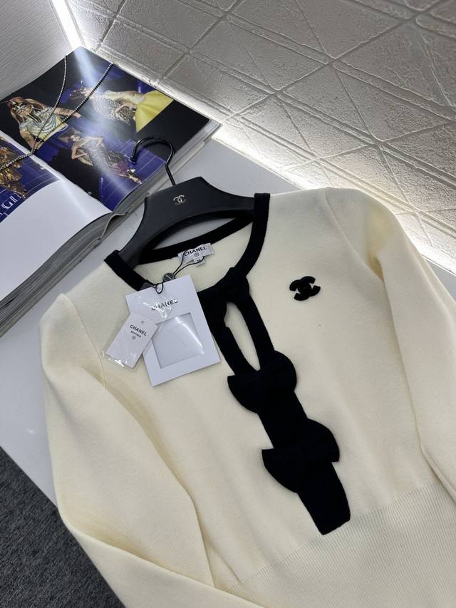 Chane* 2025 New Arrival DDD Round Neck Hollow-Out Bow Knit Long Sleeve DDD Made with custom Yb wool yarn, soft and breathable against the skin. The knit sweater cut is stretchy, creating a slimming visual effect. The cut-out design and bow embellishment, along with the contrasting colors at the collar and cuffs, create a three-dimensional effect. A double C logo on one side of the chest echoes the design, and the wide ribbed hem cinches the waist, showcasing a fashionable style. Stylish and versatile, perfect for wearing alone or layering. Custom fabrics and accessories, high-quality version, 2 colors, sizes 36, 38, 40 DDD