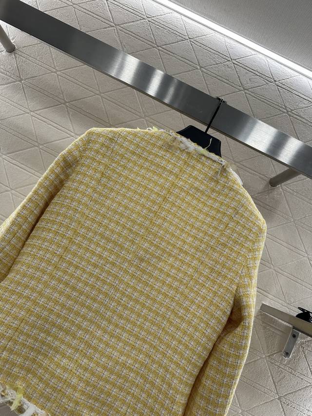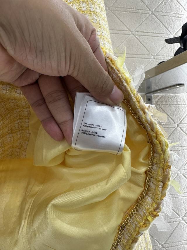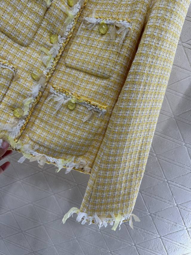 Custom Yb imported wool tweed with a distinct texture and premium quality. This coarse tweed fabric exemplifies Chanel's aristocratic style. A small stand-up collar, straight shoulders, and a single row of heavily molded camellia buttons. The base is a vibrant yellow, with a distinct texture and accentuated by yellow and white light yarn hems. This regular fit is accommodating and proportioned, showcasing the ultimate in detail and texture. Every gesture exudes elegance and sophistication. This is the top choice for fashionable wearers of all seasons. This is a sweet, youthful, and custom-made fabric. Look for the ceiling silk lining in the high-end sizes 36, 38, and 40.