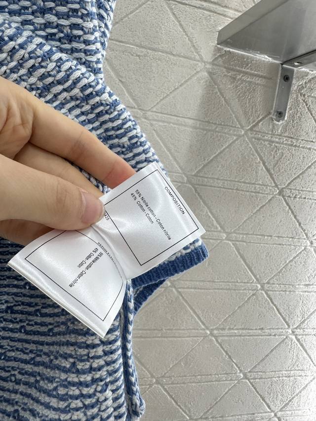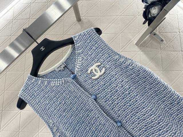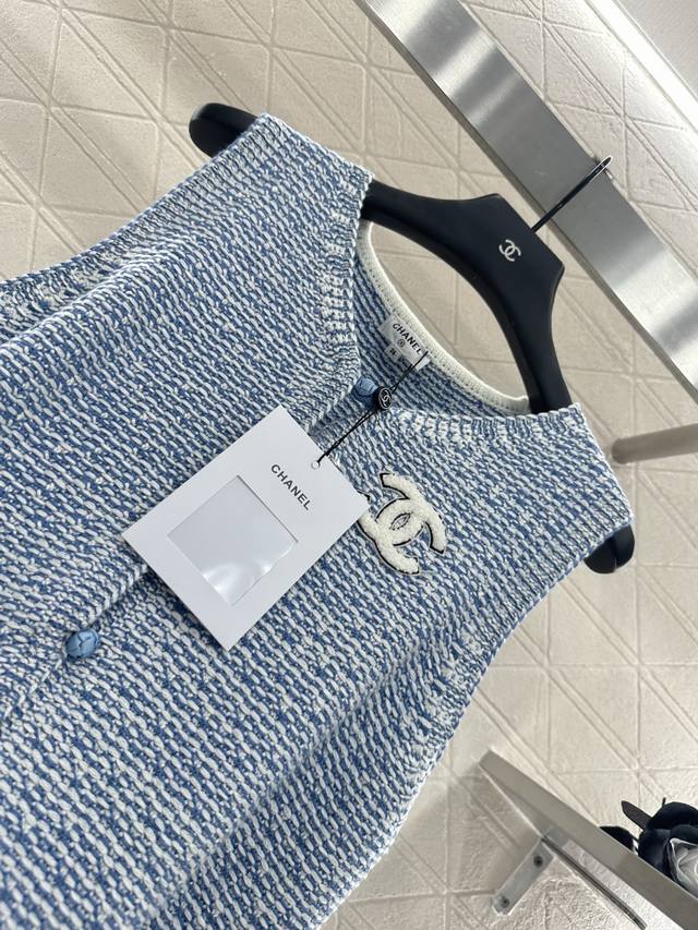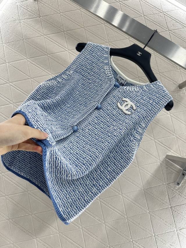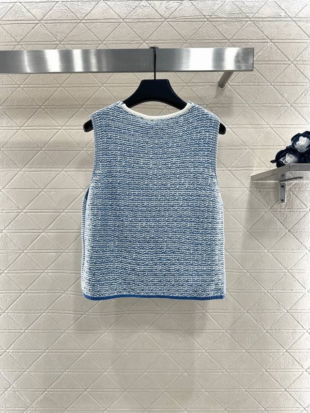 Chinese-Style Button Knit Vest. Custom-made with Yb cotton and wool yarn for a premium, comfortable crew neck. Available in blue and white, or black and white. Three-dimensional bead buttons on the front highlight the elegant Chinese style. Contrast-colored binding trims the hem for a rich, layered design. The flocking technique on the chest creates a double C pattern, echoing the brand's style and showcasing individuality and luxurious sensibility. The top exudes a light and stylish ambiance. Suitable for both single and layering. A top choice for fall and winter fashion. Custom-made fabrics and accessories. Look for the high-end version in two colors: 36, 38, and 40.