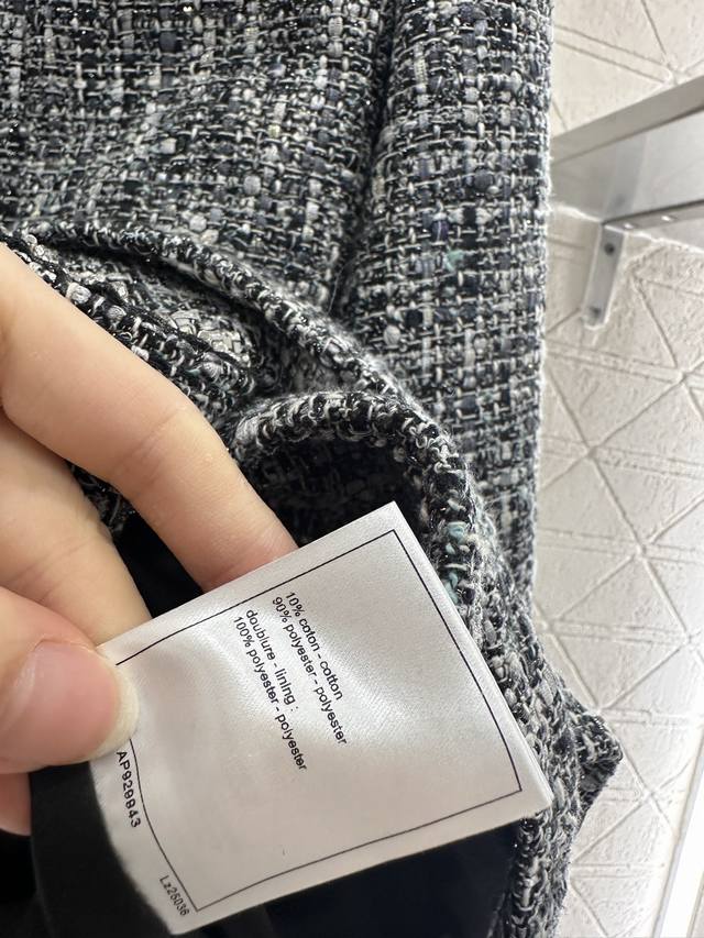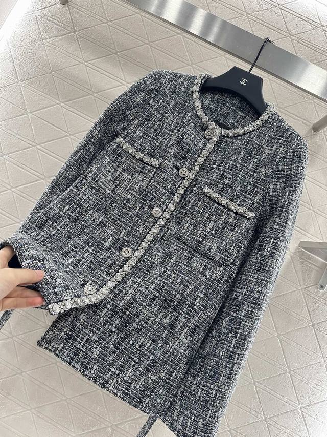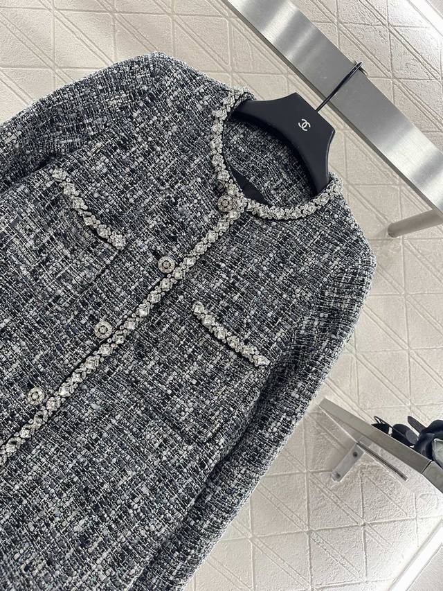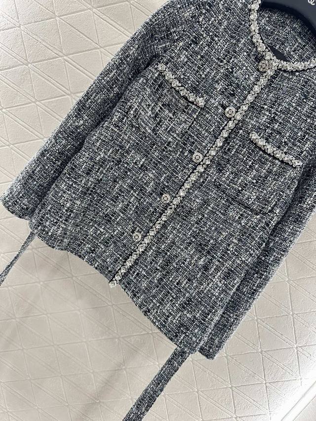 Round-Neck Dress with Beaded Trim. Made from imported Yb wool, this dress is made of premium, high-quality wool. The round-neck dress features a straight shoulder pad design that contours to the body for a slim, upright silhouette. The front and neckline are embellished with a variety of rhinestone trims that echo the tops of the pockets. The all-over black base is accented with silver yarn woven into the texture. The belt outlines the figure, creating a refined, sophisticated look. The black and silver hues create a refined, refined, and gentle aesthetic. Perfect for formal occasions. This top-of-the-line version features a custom jacquard silk lining. Custom fabrics and accessories are available in sizes 36, 38, and 40.