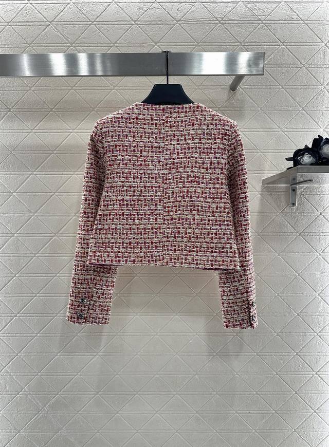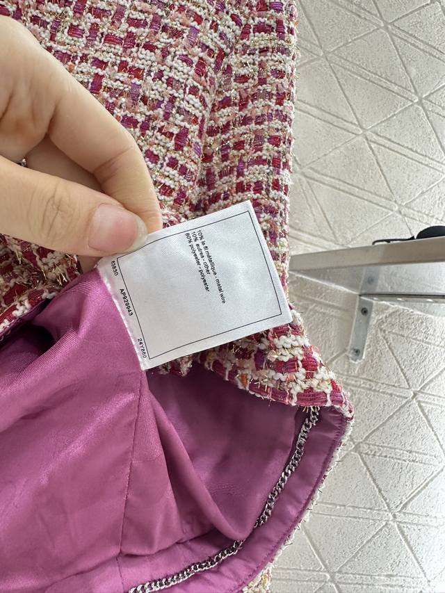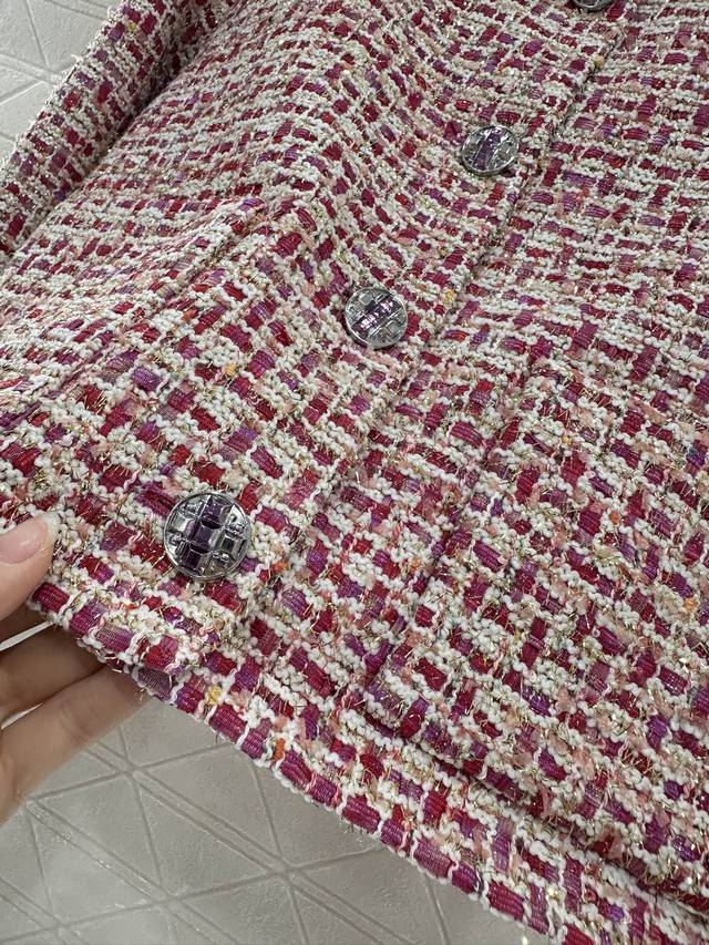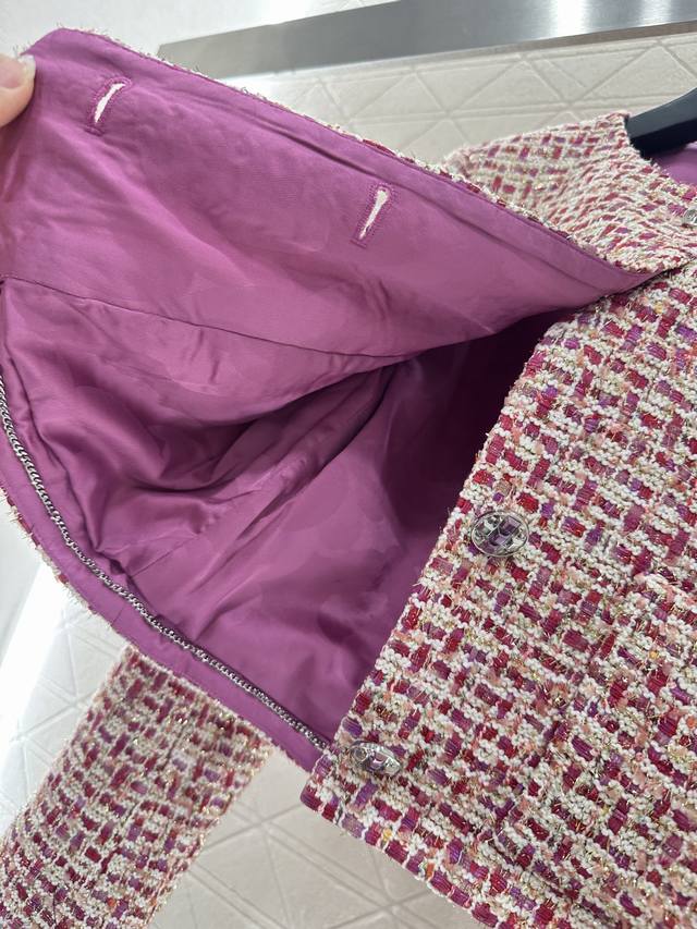 Custom Yb Imported Wool Tweed Material: Premium, Crisp, and Stylish. Straight Shoulder Round Neck Jacket with Red Padding Sets a Striking Fashion Tone. Interwoven Gold Thread, Pink, and White Weave Textures Add Color to the Design, Highlighting the Brand's Premium Style. Front Plaid Embellished with Open-Mold Purple, Round Buttons, and Symmetrical Pockets. Rich Details: Cleanly Tailored to Modify the Figure, Easily Demonstrates Sophisticated Elegance. Elegant and Stylish Wear: Perfect for Daily Commute. Silk jacquard lining, custom fabrics, and accessories. Look for the high-end versions (36, 38, 40).