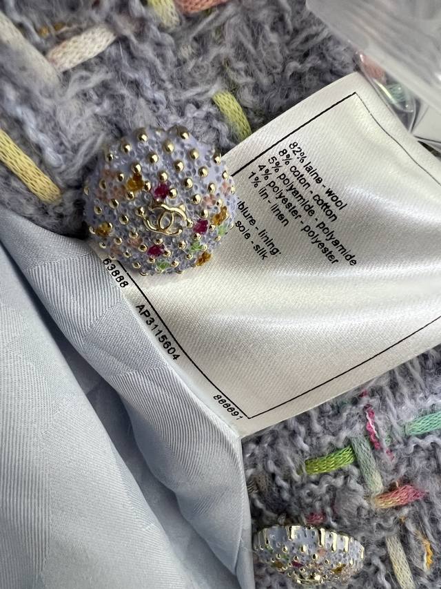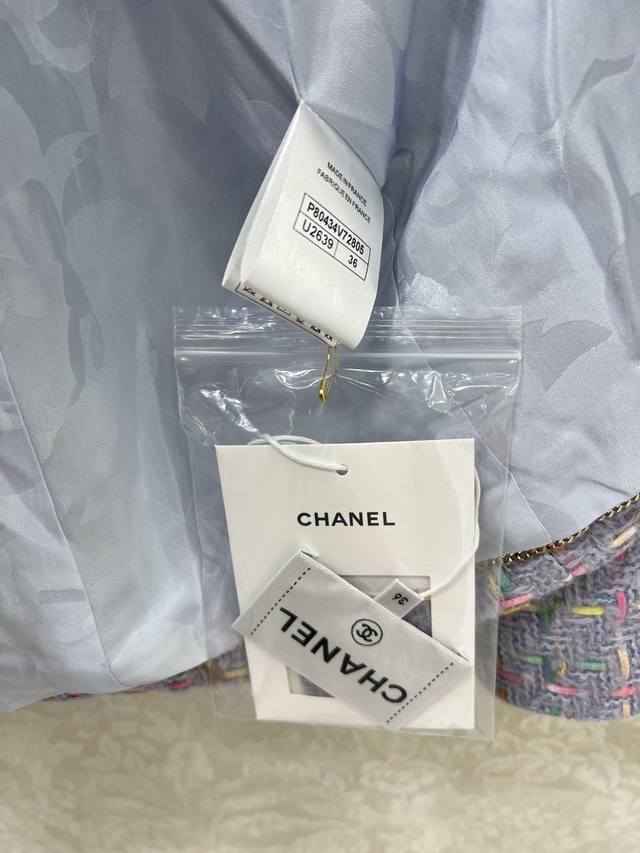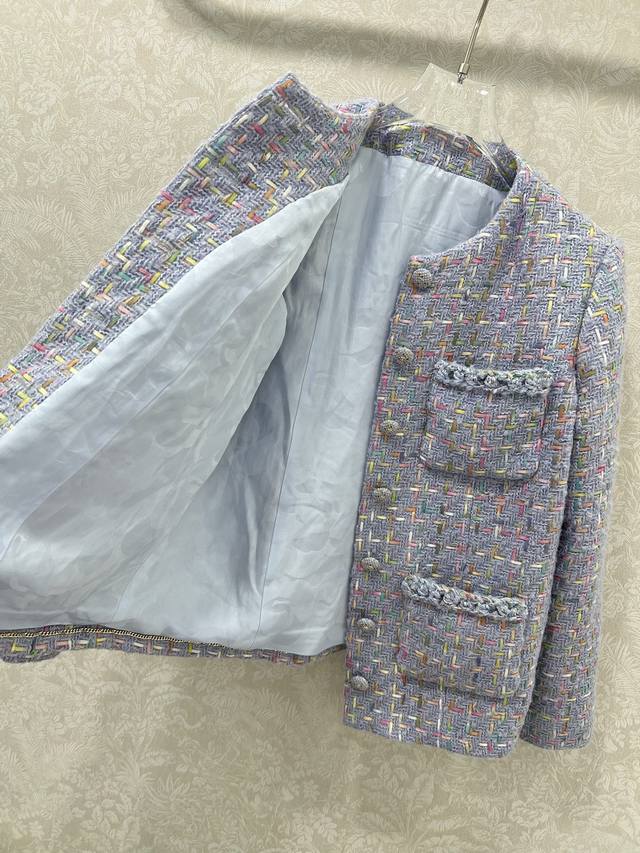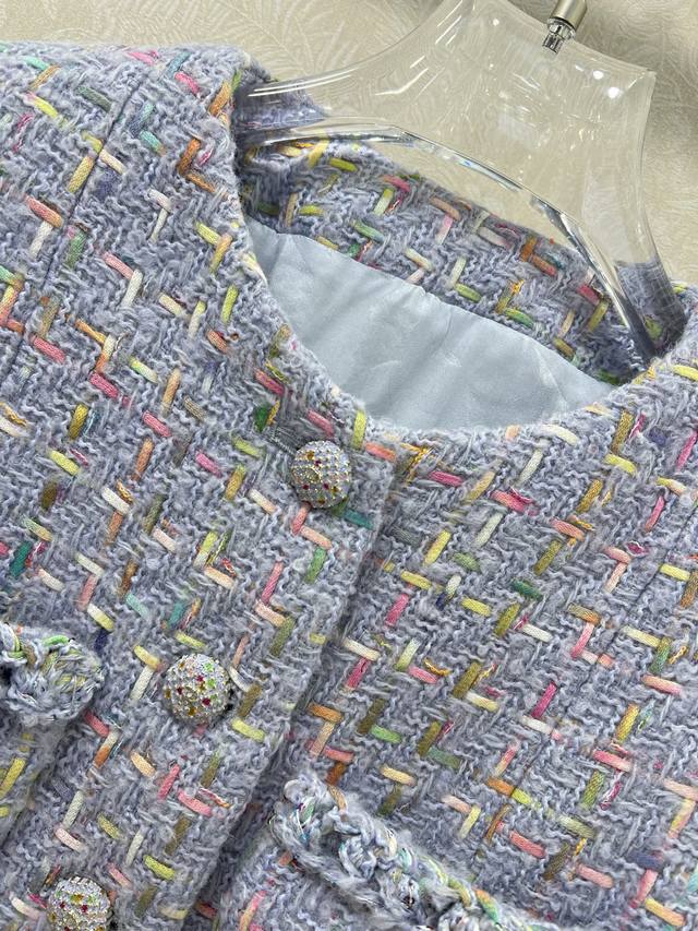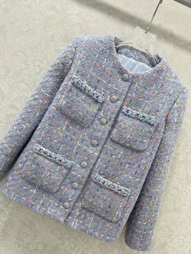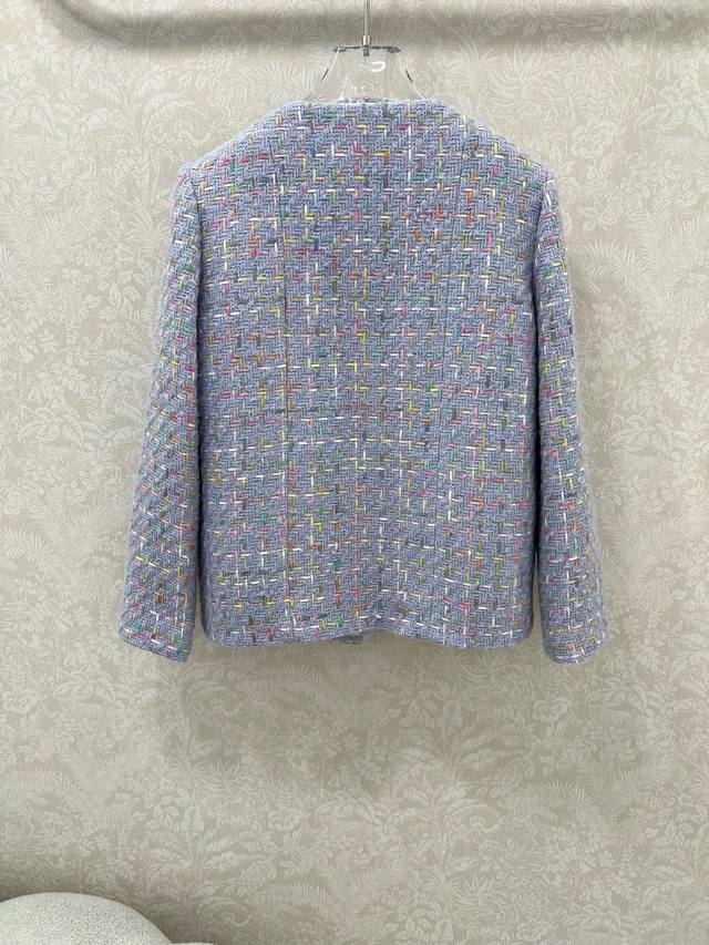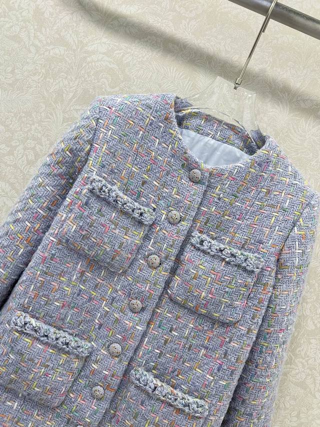 Chane* 25 new single-breasted purple tweed jacket from the Haute Couture collection. 100% silk lining. Note the details to distinguish this high-end edition! This carefully selected mixed-color tweed features a lavender base, interwoven with fine shimmering threads of pink, blue, and gold, creating a layered, dreamy texture under the light. The multi-pocket layout and metallic buttons are a classic legacy of the brand's DNA. The loose yet relaxed fit is flattering for all body types, offering both comfort and sophistication. A perfect fusion of French elegance and romanticism. Available now: 36, 38, 40B.