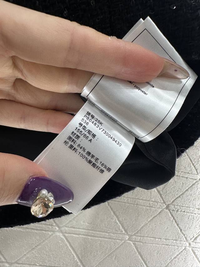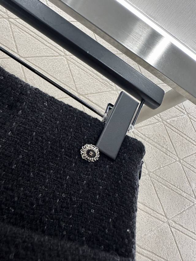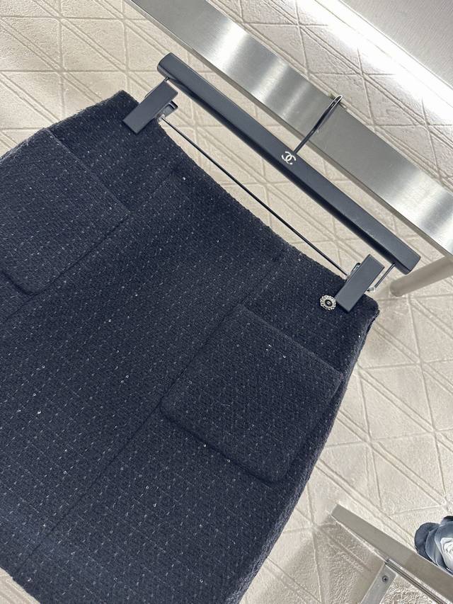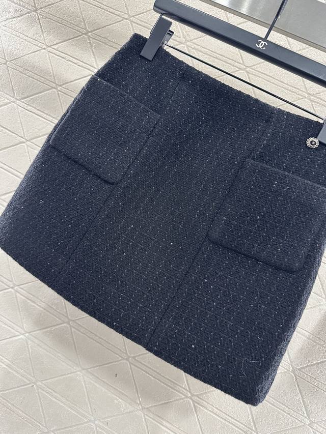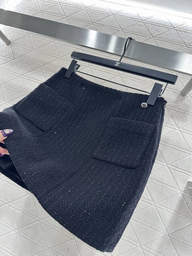 Chane* 25Au New Arrival: Checkered Tweed Sequined Dress Skirt, Custom Made. Made from imported coarse wool fabric, with a distinct texture and superior quality. The tweed fabric creates a classic Chanel-inspired look. High-waisted, pocketed, short skirt with a flattering, straight silhouette. The overall charcoal black woven fabric is interwoven with sequins to create a checkered texture, elegant without being dull. A single-sided waist embellishment with rhinestone double C-shaped buttons adds a touch of luxury and charm. Exudes a sophisticated, elegant style, perfect for autumn/winter transitional wear. Customized fabrics and accessories, high-quality version available. Color: Black. Sizes: 36, 38, 40.