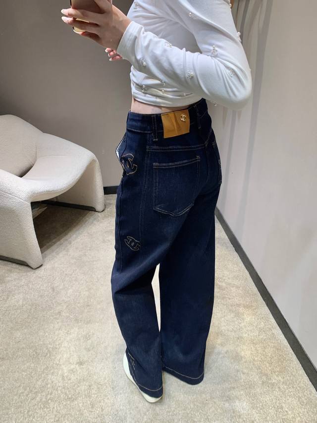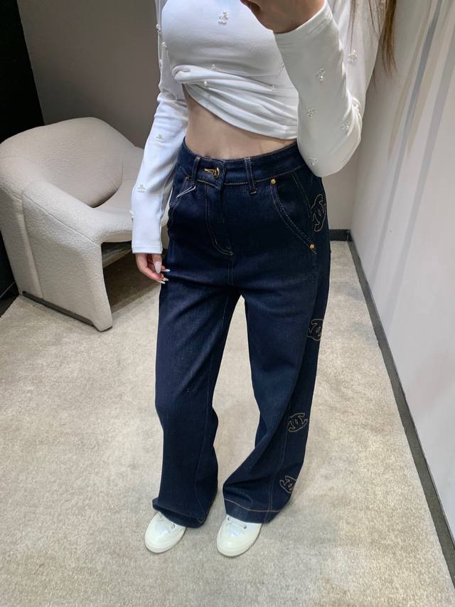 Chane* 25Fw Early Autumn New Style Retro Washed Denim Pants with Side Embroidery | Exclusive High-Quality Production! Made from carefully selected retro washed denim fabric, the colors are rich and the texture is crisp. After special processing, the visual focus is on the side embroidered double C logo: the classic double C pattern outlined in gold thread is distributed along the pants, exuding a sophisticated, timeless feel. The high-waisted cut neatly accentuates the waistline, while the wide-leg style is casual yet elongates the legs, radiating French effortless chic with every step. Available now in sizes S, M, L, D.D.