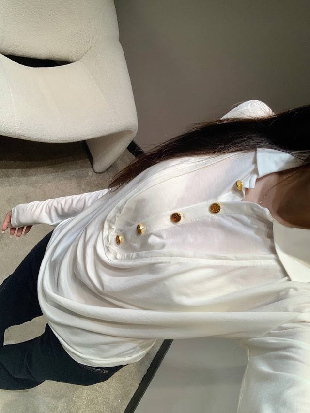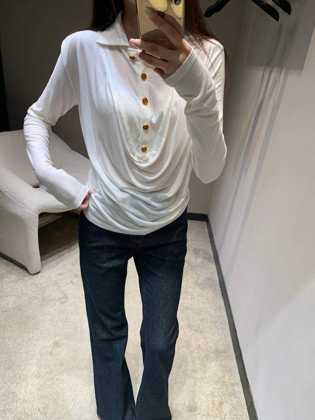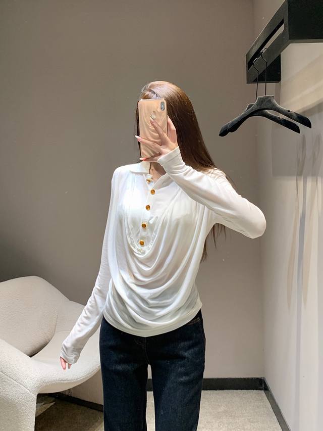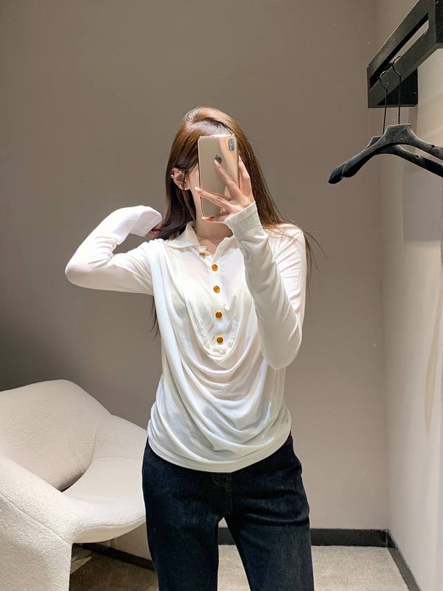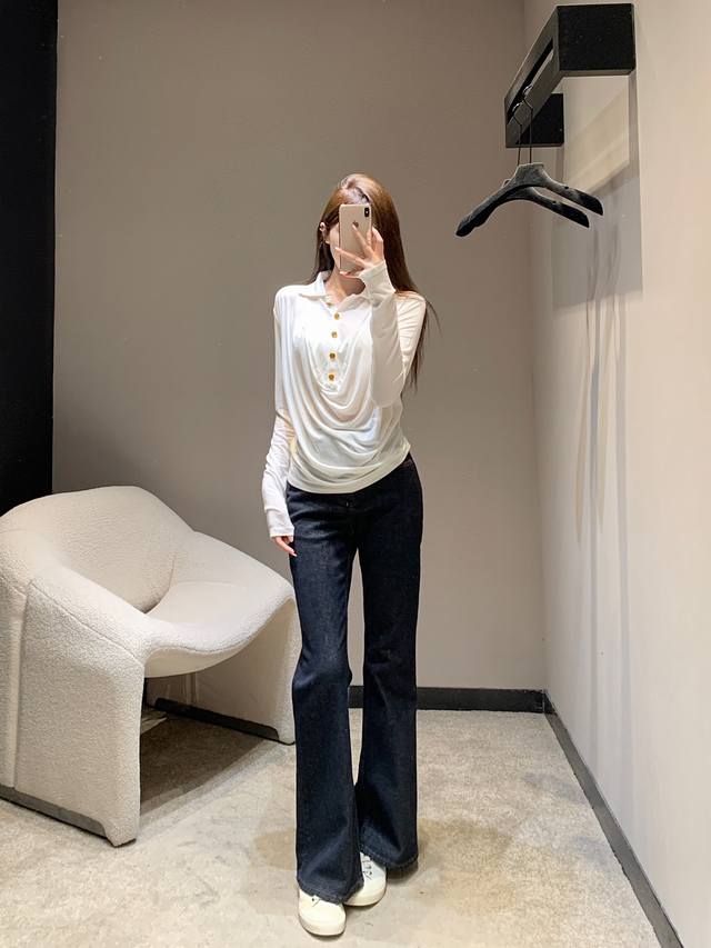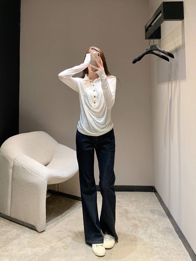 Chane* 25Fw Early Fall new polo flared-collar stretch long-sleeved T-shirt | Exclusive high-top edition! Made with skin-friendly stretch fabric, it creates a close-fitting yet unconstrained fit for maximum comfort. The fusion of the polo collar and flared collar is the finishing touch, combining the sharpness of the polo collar with the softness of the flared collar, retaining French elegance while adding a touch of casual laziness. Metallic buttons embellish the design, showcasing exquisite craftsmanship in every detail. Available now in sizes S, M, L, D, D.