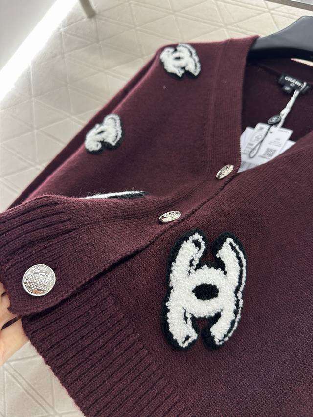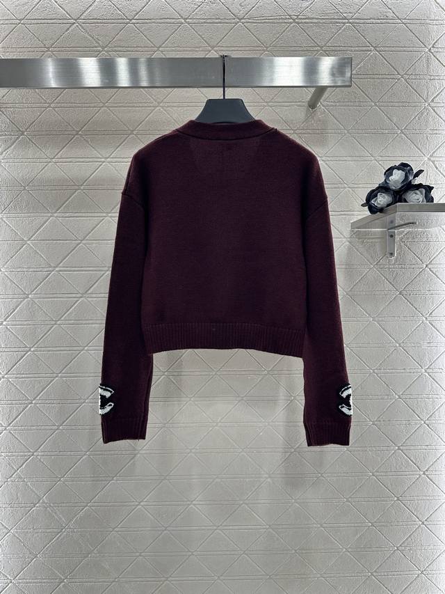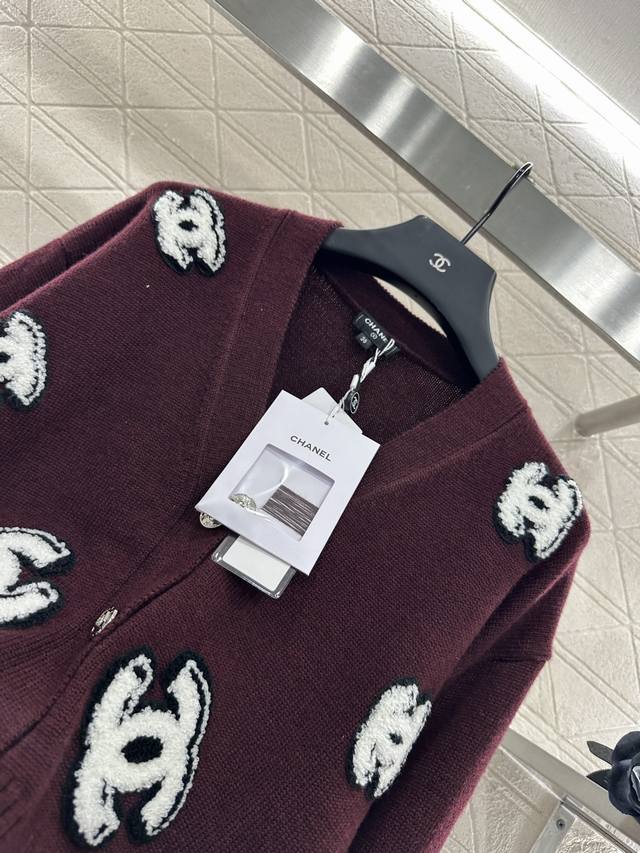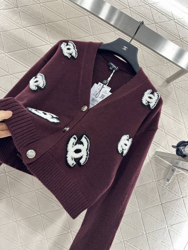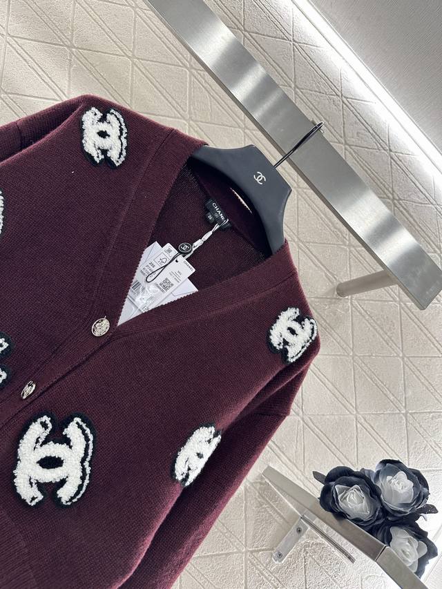 Double C Knit Cardigan. Custom-made with Yb cotton yarn, this cardigan is comfortable and easy to wear. This V-neck, cropped cardigan features custom-made buttons that enhance the neckline and add a touch of refinement. The all-over embellishment features a three-dimensional flocked Double C logo, adding vibrant color contrast for a stylish look. Break the dour autumn and winter vibe with this stylish, high-end custom fabric and accessories. Look for the highest-quality version in three colors: 36, 38, and 40.