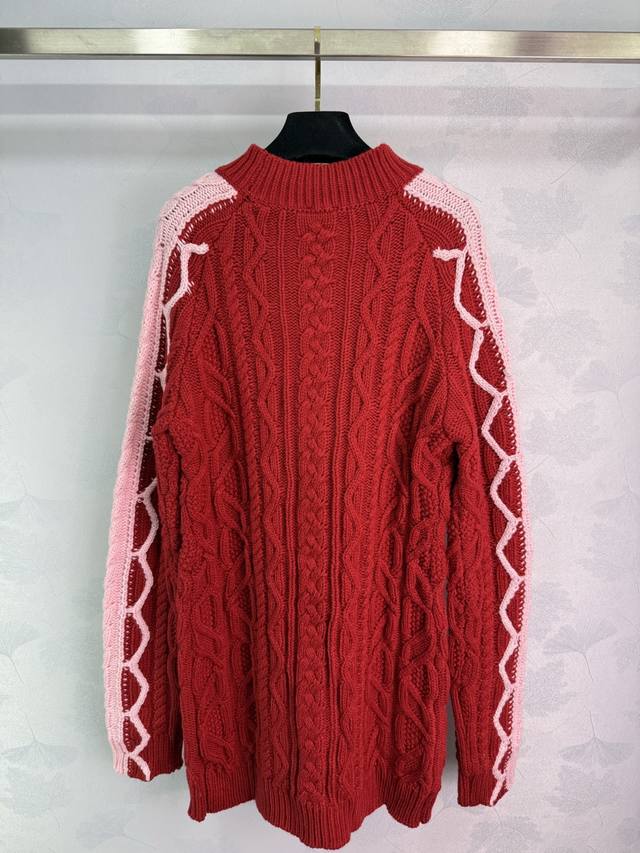 Chane* New Early Fall 2025 Cable-knit Color-contrast Crochet Sweater Dress. Custom-woven YB wool yarn for a premium, comfortable pullover sweater dress. Alternating vertical red and pink tones accent the dress with cable-knit and geometric patterns. Richly layered crochet texture. Rhinestones accent the chest. The iconic Double C logo highlights the brand's personality, elevating the look. A simple silhouette exudes individuality, while a refined, relaxed look exudes a relaxed ambiance. Oversized and relaxed, this sweater offers a stylish and effortless look. Perfect for both solo and layering. A perfect fall/winter fashion choice! 1 color, 3 sizes. Sml T226B.