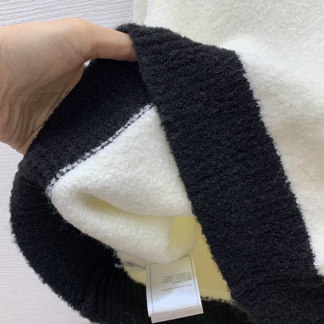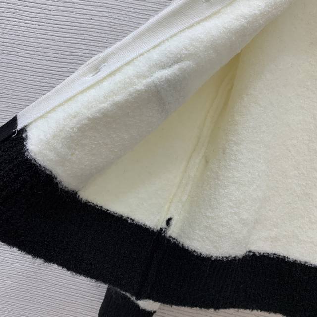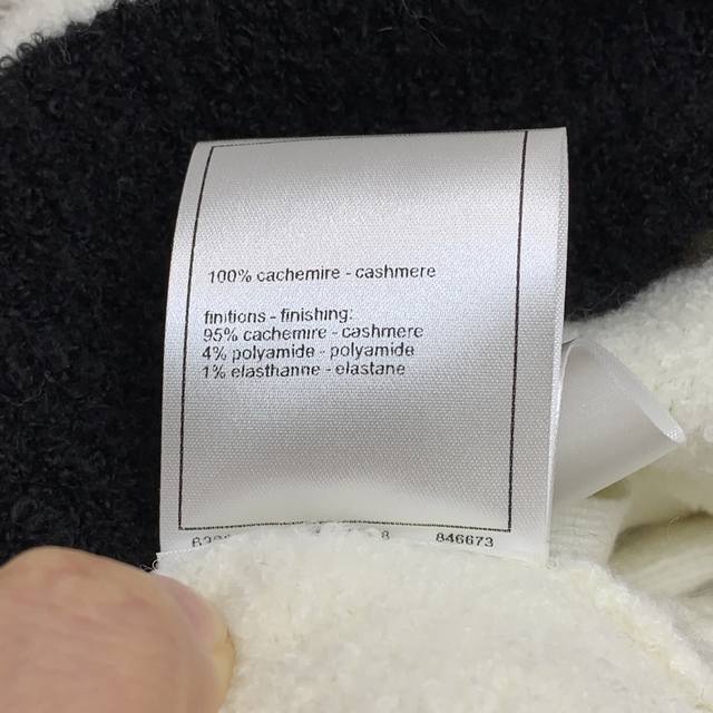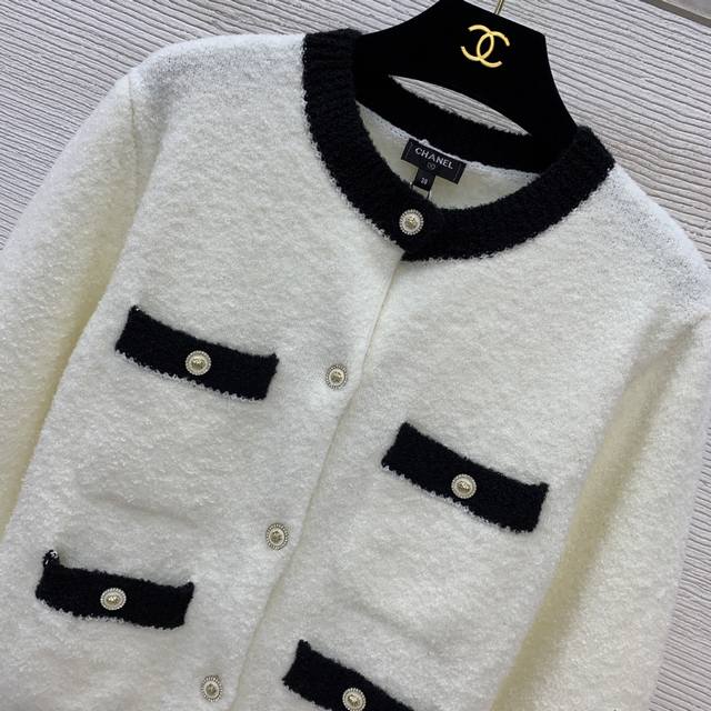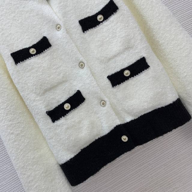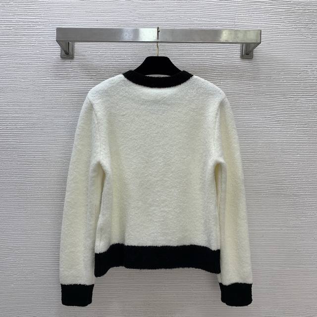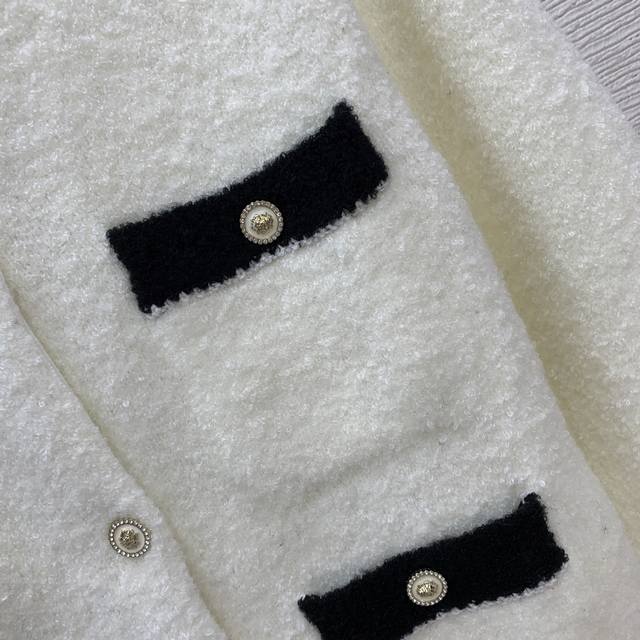 Chane* New High-End Custom 100% Cashmere Yarn Thick Fabric, Color-Blocked Button-Down Crew Neck Long-Sleeve Knit Cardigan, Short Style! Available in Off-White, Black, Sizes 36, 38, and 40. Size 38: Shoulder Width 40cm, Bust 92cm, Sleeve Length 59cm, Length 54cm. (DDD)