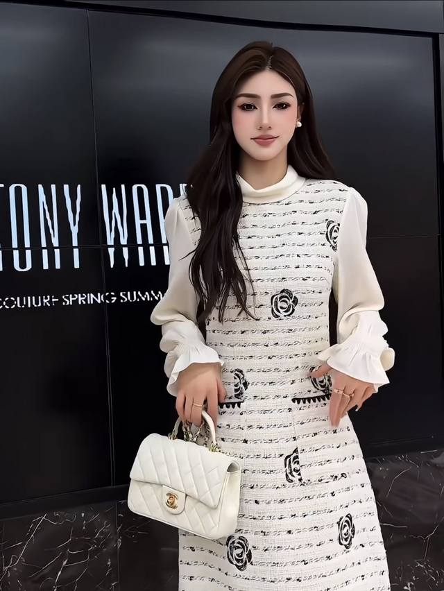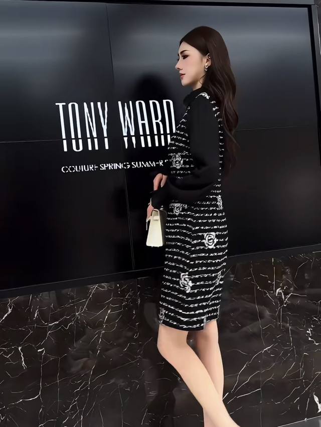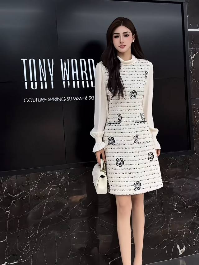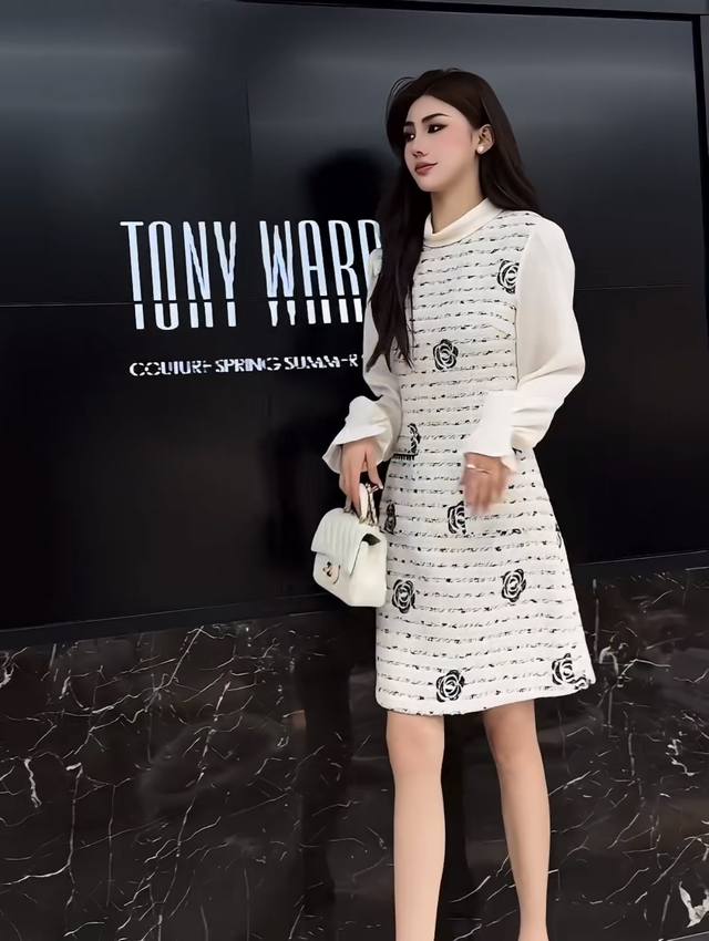 Chane* New High-End Custom Camellia Striped Coarse Fabric Dress, Elegant and Refined Chanel-Style Double Pocket Turn-Down Collar Slim Fit Long Sleeve Dress! Black, Apricot, Size S: Shoulder Width 36cm, Bust 84cm, Waist 74cm, Sleeve Length 63cm, Dress Length 88cm (DDD)